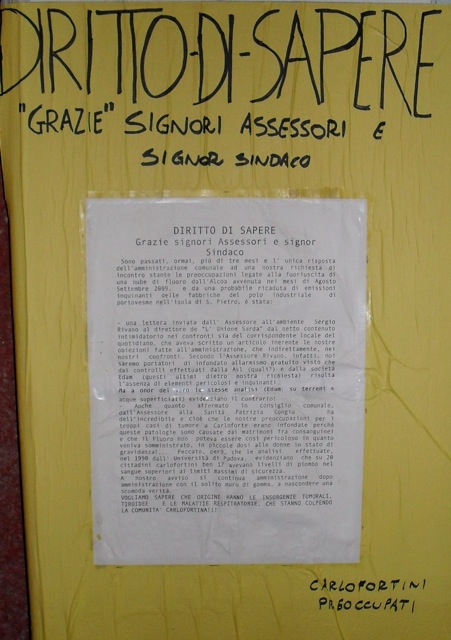 Nel novembre 2009 le associazioni ecologiste Gruppo d’Intervento Giuridico e Amici della Terra, dietro forte richiesta popolare, chiedevano alle amministrazioni pubbliche competenti informazioni sull’inquinamento a Carloforte, monitoraggi ambientali e indagini epidemiologiche. Le risposte sono state parziali e i residenti hanno il diritto di sapere. Non si contano le prese di posizione del Comitato Carlofortini Preoccupati, al quale và tutto il sostegno delleassociazioni ecologiste Gruppo d’Intervento Giuridico e Amici della Terra.