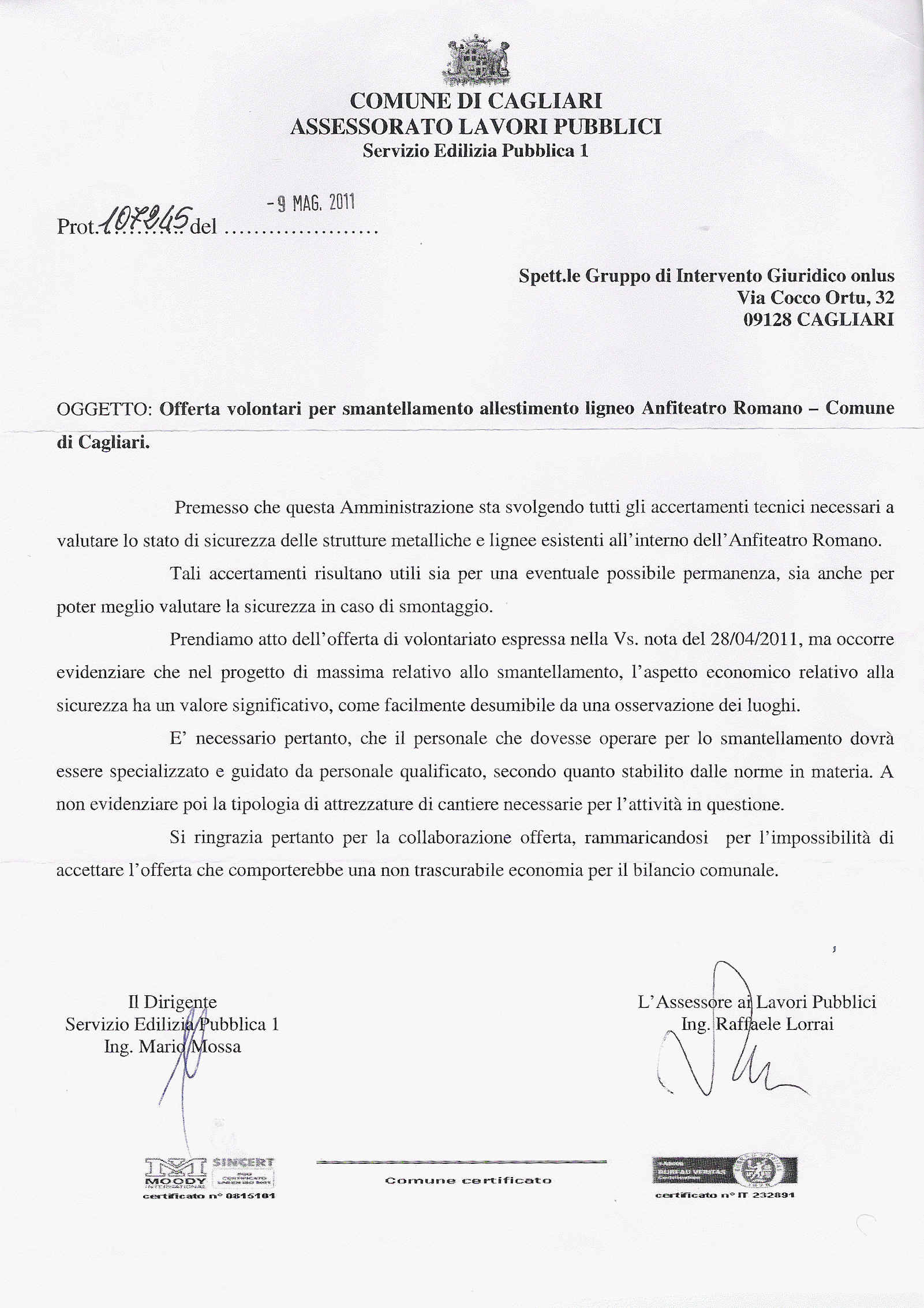 Il Comune di Cagliari, con una nota co-firmata dall’Assessore comunale dei lavori pubblici Raffaele Lorrai e dal dirigente del Servizio edilizia pubblica 1 Mario Mossa (nota n. 107245 del 9 maggio 2011) ha cortesemente declinato l’offerta di oltre 300 ore di lavoro gratuito offerto da volontari in base all’appello promosso dalle associazioni ecologiste Gruppo d’Intervento Giuridico e Amici della Terra.