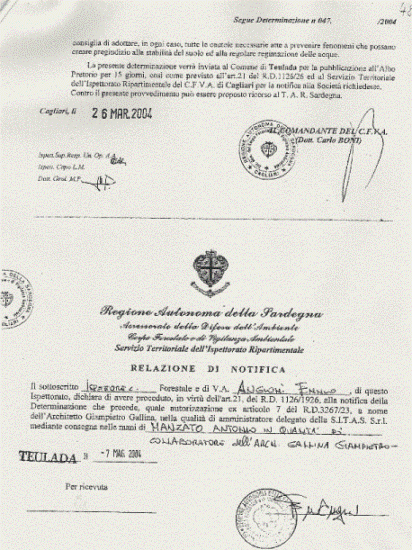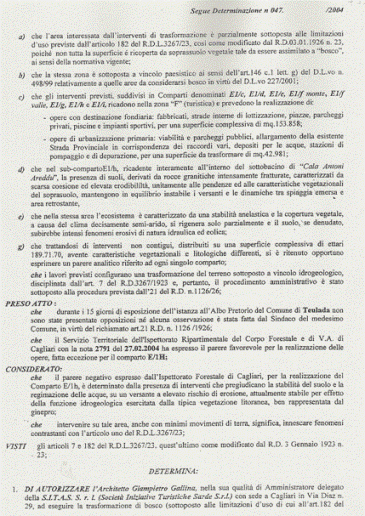 Ricordiamo che la determinazione del Comandante del Corpo forestale e di vigilanza ambientale n. 47 del 26 marzo 2004 ha autorizzato, ai sensi dell’art. 7 del regio decreto n. 3267/1923 e s.m.i., la trasformazione di terreni sottoposti al vincolo idrogeologico per vari comparti dell’unico piano di lottizzazione turistico-edilizio e ha espresso diniego per l’intero comparto E/1h, previsto proprio a Cala Antoni Areddu (Capo Spartivento).