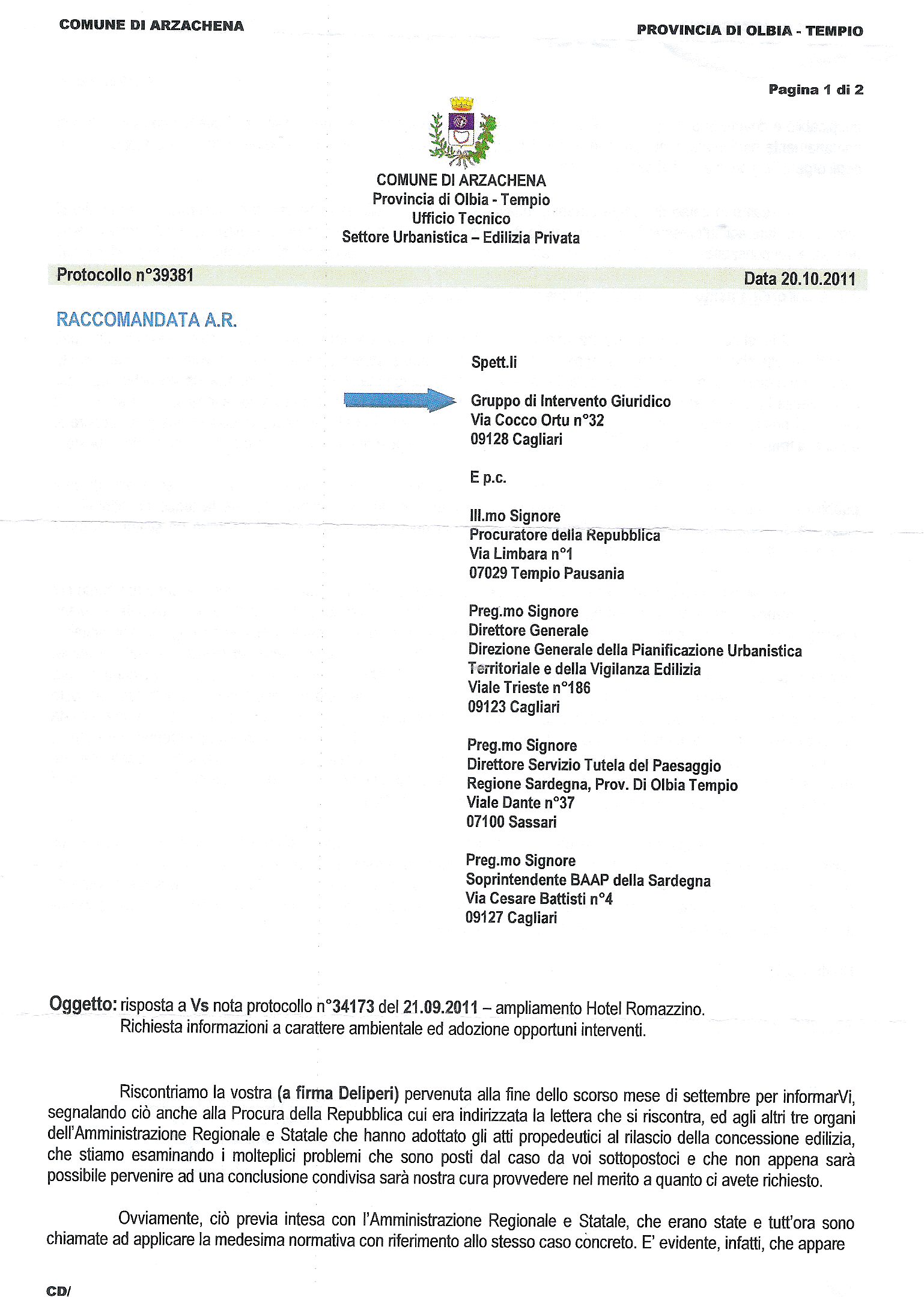 Il Comune di Arzachena – Area tecnica ha risposto (nota n. 39381 del 20 ottobre 2011) alle richieste di informazioni a carattere ambientale e di adozione di opportuni interventi inoltrate dalle associazioni ecologiste Gruppo d’Intervento Giuridico e Amici della Terra (9 settembre 2011 e 31 ottobre 2011) riguardo l’ampliamento previsto dell’Hotel Romazzino (gruppo Colony Capital) nella prestigiosa ed esclusiva loc. Liscia di Vacca, tutelata con vincolo paesaggistico (decreto legislativo n. 42/2004 e s.m.i.), in Comune di Arzachena (OT).