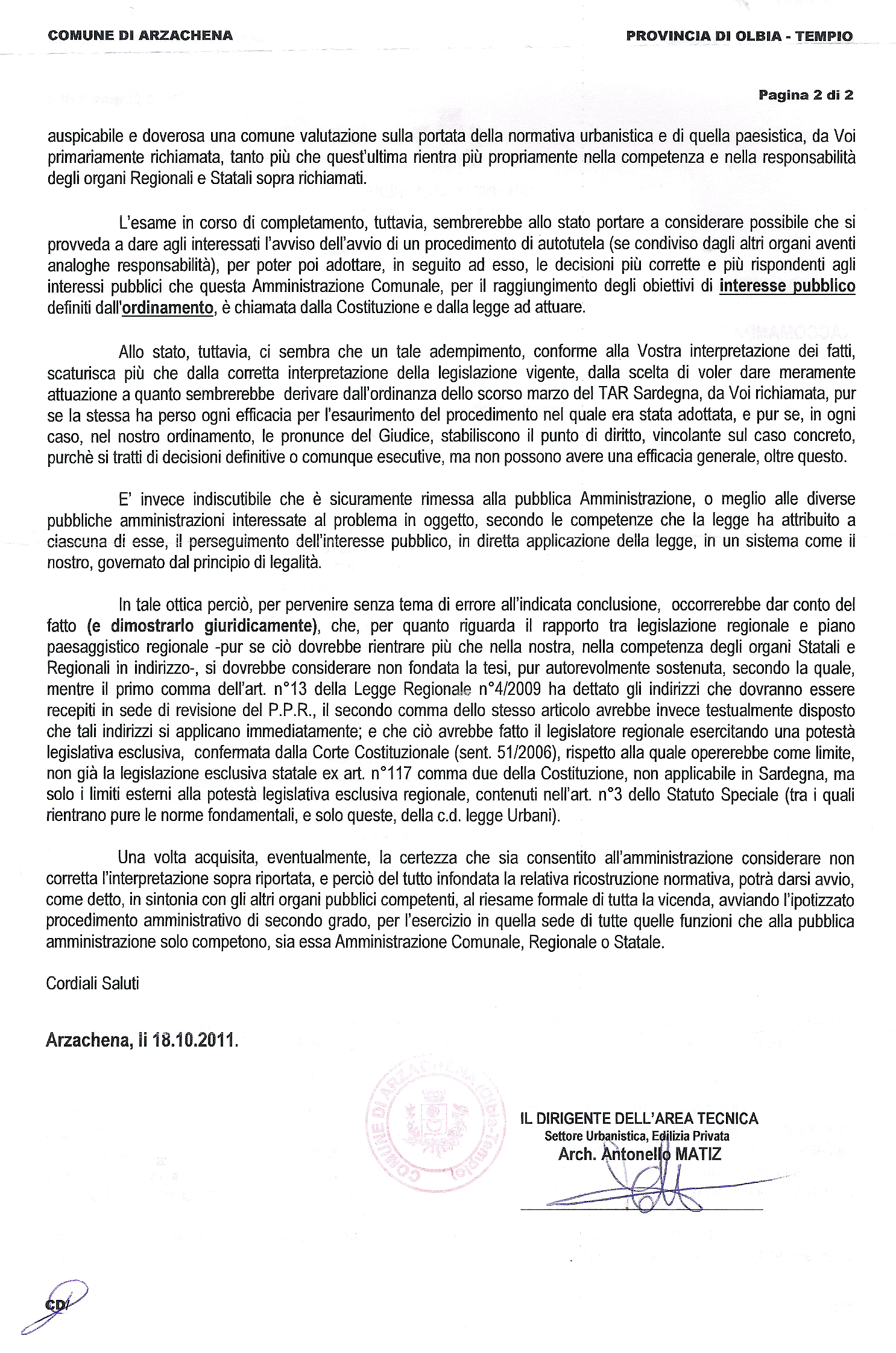 In buona sostanza, ricerca una soluzione condivisa con le amministrazioni statali e regionali che si sono espresse e si devono esprimere (Servizio regionale tutela del paesaggio, Soprintendenza per i beni ambientali di Sassari) sul caso dell’applicabilità della legge regionale Sardegna n. 4/2009, il c.d. piano per l’edilizia, anche nelle aree definite “quale ‘bene paesaggistico d’insieme’ e ‘risorsa strategica fondamentale’ (art. 19, comma 1)” dal piano paesaggistico regionale – P.P.R. (artt. 19-20 delle norme di attuazione), come la fascia costiera (spesso ben più ampia di quella dei mt. 300 della battigia marina), in seguito ai noti principi espressi dal T.A.R. Sardegna proprio su questo caso (ordinanza Sez. II, 18 marzo 2011, n. 135).