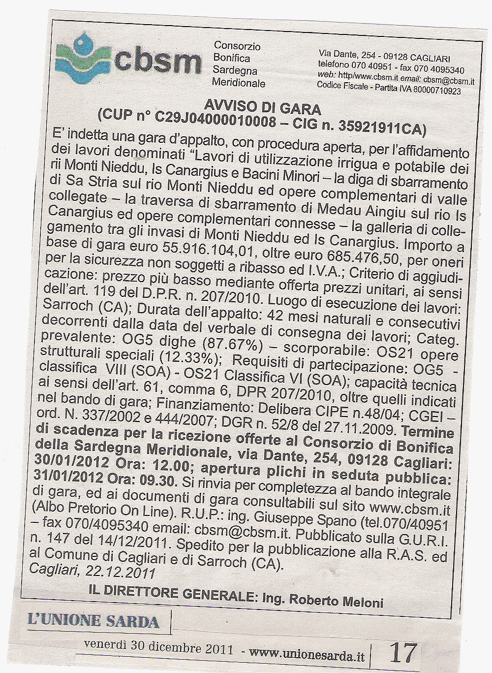 Il Consorzio di Bonifica della Sardegna Meridionale – come avevamo preannunciato – ha bandito una nuova gara d’appalto (56,6 milioni di euro a base d’asta, bando integrale di gara d’appalto + disciplinare di gara) e le associazioni ecologiste Gruppo d’Intervento Giuridico, Amici della Terra e Lega per l’Abolizione della Caccia hanno inoltrato (23 gennaio 2012) specifico ricorso avverso la realizzazione priva di preventivi e vincolanti procedimenti di valutazione d’impatto ambientale cumulativa con le reti di distribuzione idrica (nemmeno progettate e finanziate), di valutazione ambientale strategica, di valutazione di incidenza. Non si è a conoscenza nemmeno dell’emanazione della prescritta autorizzazione paesaggistica (decreto legislativo n. 42/2004 e s.m.i.).