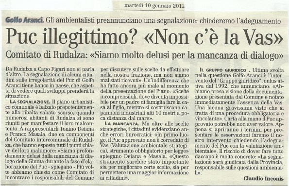 Le associazioni ecologiste Gruppo d’Intervento Giuridico e Amici della Terra hanno inoltrato (3 febbraio 2012) specifico ricorso alla Commissione europea, al Direttore generale delle valutazioni ambientali del Ministero dell’ambiente, al Direttore generale regionale della pianificazione urbanistico territoriale, al Direttore del Settore regionale sostenibilità ambientale e valutazione impatti, al Direttore del Settore ambiente e sostenibilità della Provincia di Olbia – Tempio e al Comune di Golfo Aranci avverso l’avvenuta adozione del piano urbanistico comunale – P.U.C. di Golfo Aranci in assenza di preventiva procedura di valutazione ambientale strategica – V.A.S.