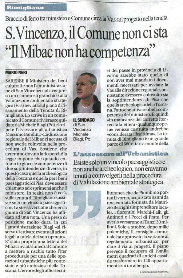 “Rimigliano, il piano è corretto e non ci sono stop”. L’amministrazione comunale replica alle accuse della Direzione regionale per i beni culturali. (http://iltirreno.gelocal.it/piombino/cronaca/2012/03/01/news/rimigliano-il-piano-e-corretto-non-ci-sono-stop-1.3242351) (Paolo Federighi)