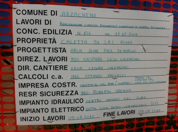 Le associazioni ecologiste Gruppo d’Intervento Giuridico e Amici della Terra, grazie alla preziosa segnalazione del giornalista Francesco Giorgioni, inoltrano (10 marzo 2012) una specifica richiesta di informazioni a carattere ambientale e adozione degli opportuni interventi riguardo la realizzazione in corso di attuazione di un “complesso residenziale commerciale e albergo residenziale” (29 unità residenziali + resort + servizi) per conto della Caletta 91 s.r.l. (Roma), in loc. Laconia, in Comune di Arzachena (OT), in forza di concessione edilizia n. 136 del 18 dicembre 2009.