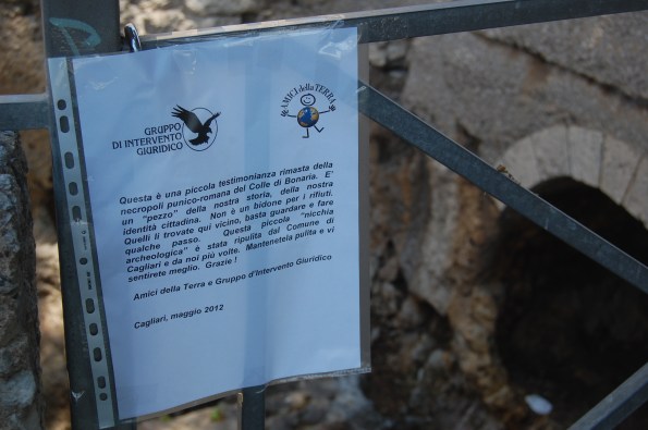 “Questa è una piccola testimonianza rimasta della necropoli punico-romana del Colle di Bonaria.    E’ un “pezzo” della nostra storia, della nostra identità cittadina.    Non è un bidone per i rifiuti. Quelli li trovate qui vicino, basta guardare e fare qualche passo.  Questa piccola ‘nicchia archeologica’ è stata ripulita dal Comune di Cagliari e da noi più volte.  Mantenetela pulita e vi sentirete meglio.  Grazie !