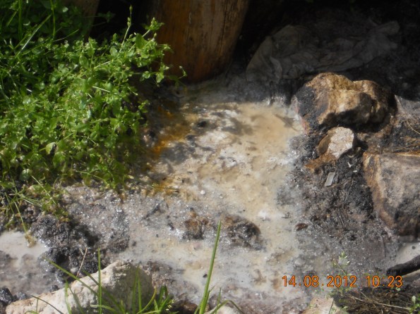 Al momento del sopralluogo,presente uno dei suddetti pastori, non erano visibili tracce di inquinamento. Quanto … segnalato è probabilmente il frutto del lavaggio di stoviglie, poichè lo scarico dell’acqua del lavabo interno alla cascina fuoriesce da questa attraverso un tubo visibile sul lato sud-est.