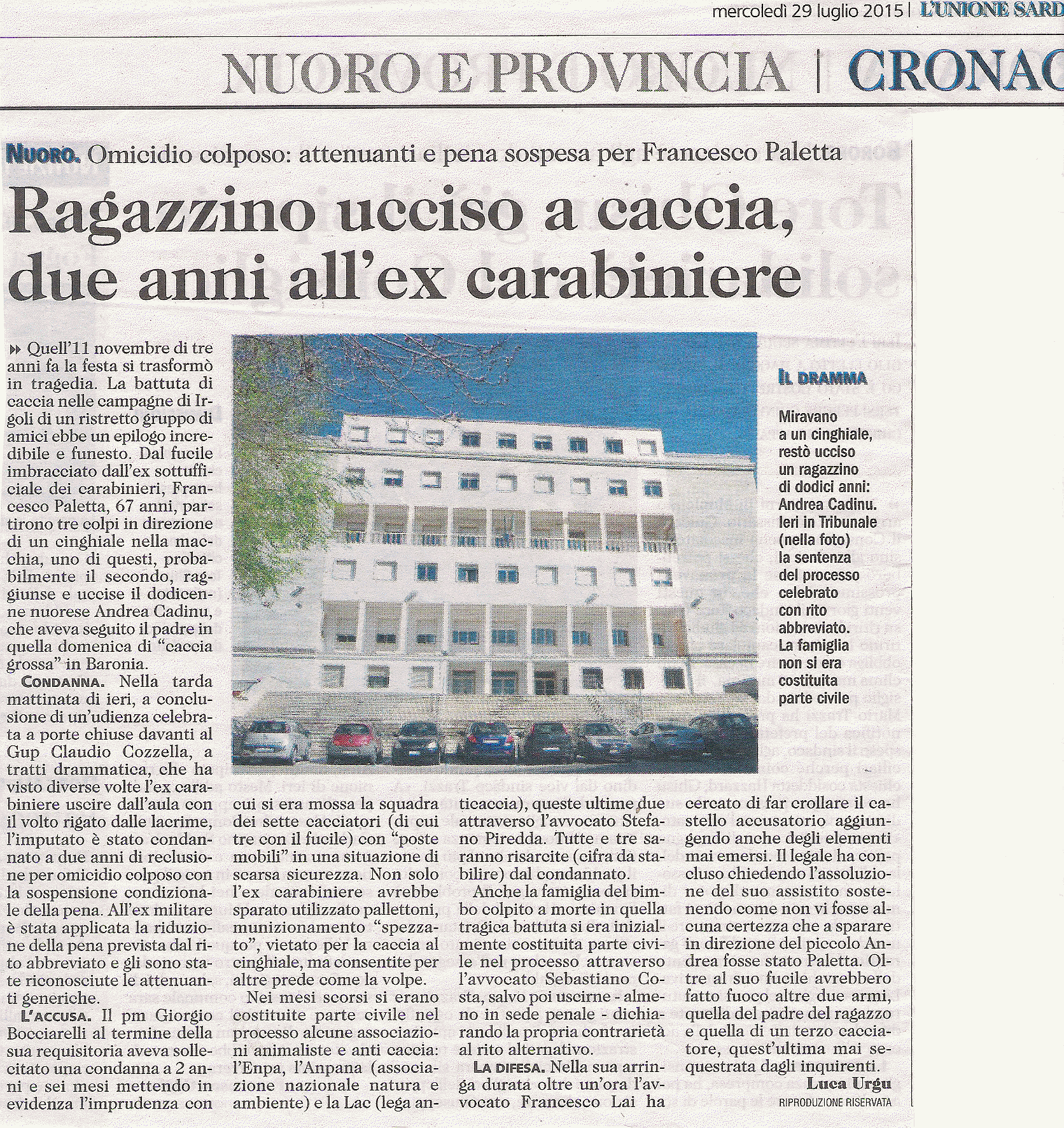 Nuoro, omicidio colposo l’accusa per l’ex brigadiere dei carabinieri che sparando a un cinghiale colpì il 12enne Andrea Cadinu. (Valeria Gianoglio): http://lanuovasardegna.gelocal.it/nuoro/cronaca/2014/07/01/news/bambino-ucciso-a-caccia-il-pm-chiede-il-rinvio-a-giudizio-1.9520310