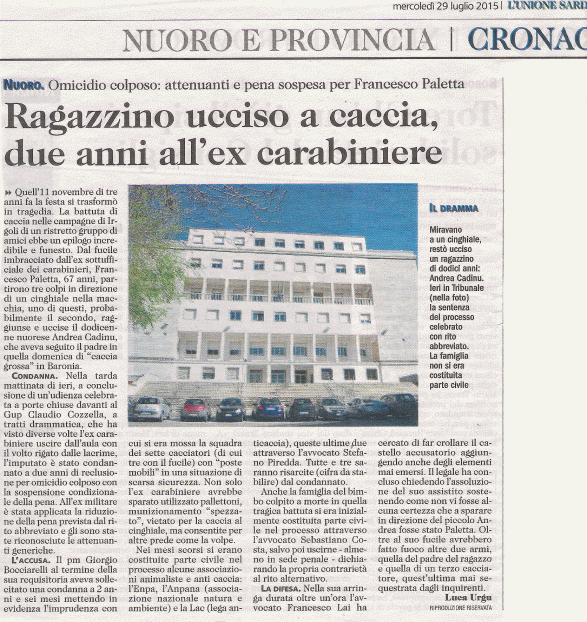 L’Unione Sarda, 29 luglio 2015, caccia bambino morto processo