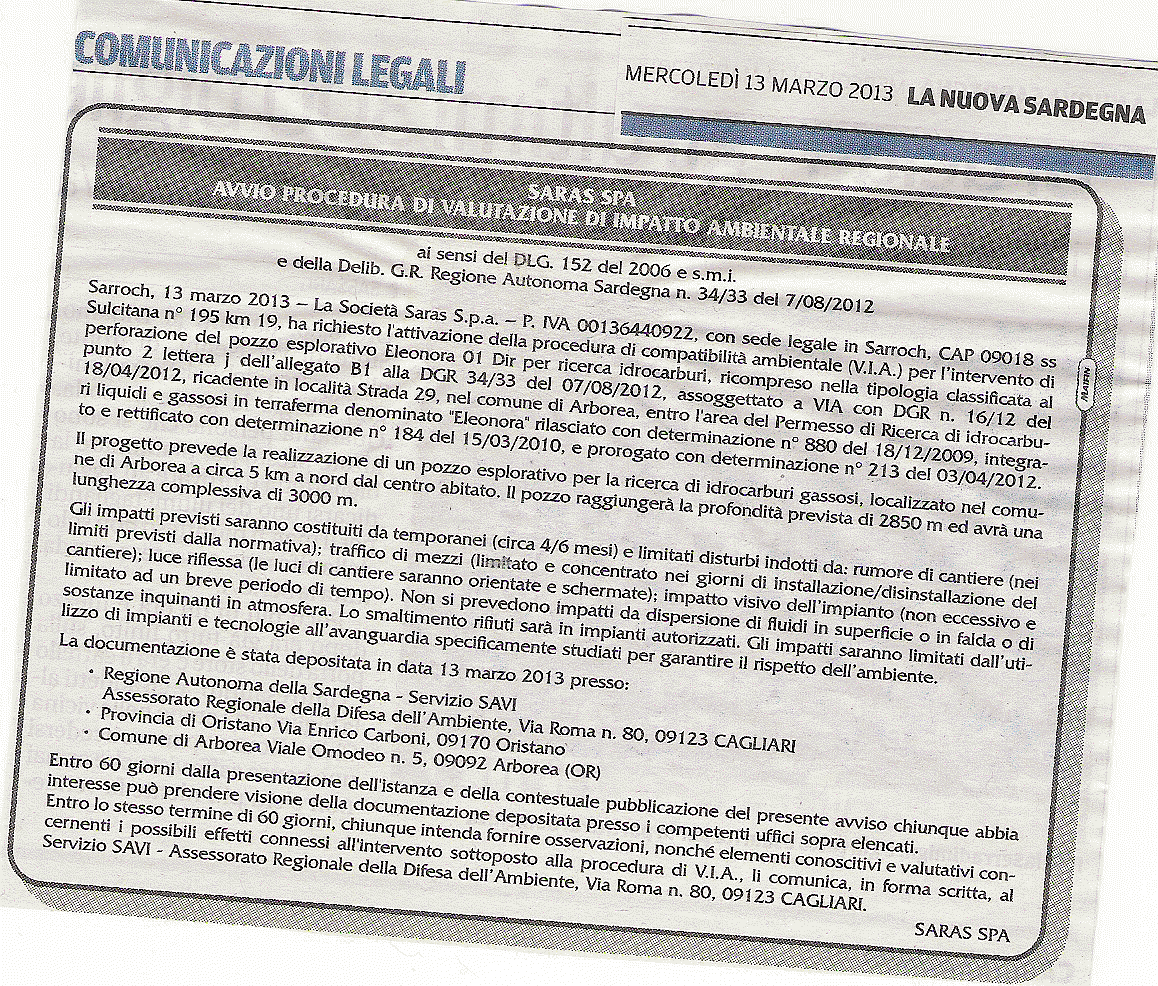 Le associazioni ecologiste Gruppo d’Intervento Giuridico e Amici della Terra hanno inoltrato (17 marzo 2013) al Servizio S.A.V.I. dell’Assessorato della difesa dell’ambiente della Regione autonoma della Sardegna un primo atto di “osservazioni” nel procedimento di valutazione di impatto ambientale (V.I.A.) riguardante il progetto di perforazione esplorativa (a circa 3.000 metri di profondità) concernente il permesso di ricerca di idrocarburi “Eleonora” del Gruppo Saras s.p.a.