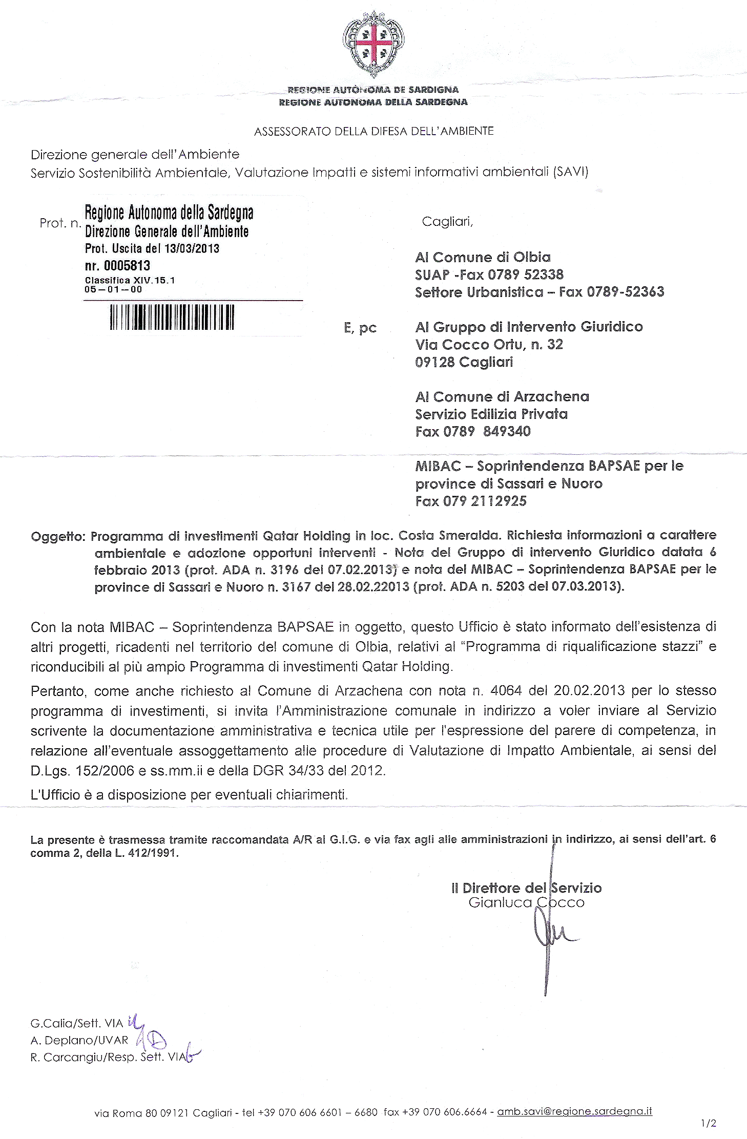 Il Servizio valutazione impatti (S.A.V.I.) della Regione autonoma della Sardegna è ritornato in modo piuttosto fermo sul complesso di interventi proposti dalla Qatar Holding in assenza dei necessari e vincolanti procedimenti di valutazione ambientale strategica (V.A.S.) e di verifica di assoggettabilità a valutazione di impatto ambientale.