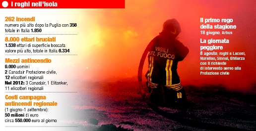 Primi dati, provvisori ma drammatici, sugli incendi in Italia, in Sardegna in particolare: fra l’1 gennaio e il 14 agosto 2013 l’Isola è stata interessata da ben 262 incendi boschivi con 1.574 ettari di bosco bruciati.