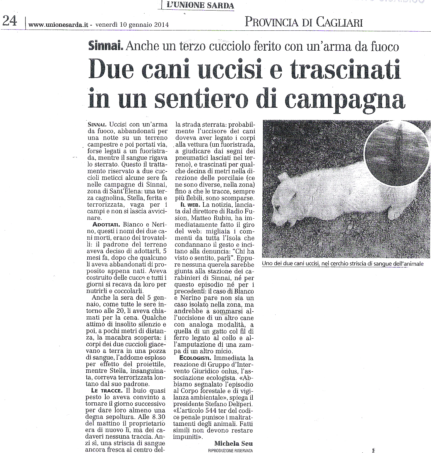 L’associazione ecologista Gruppo d’Intervento Giuridico onlus ha provveduto (8 gennaio 2014) a segnalare al Corpo forestale e di vigilanza ambientale l’avvenuta uccisione di due cani in località S. Elena, alla periferia di Sinnai (CA), probabilmente con colpi di arma da fuoco lo scorso 5 gennaio 2014.
