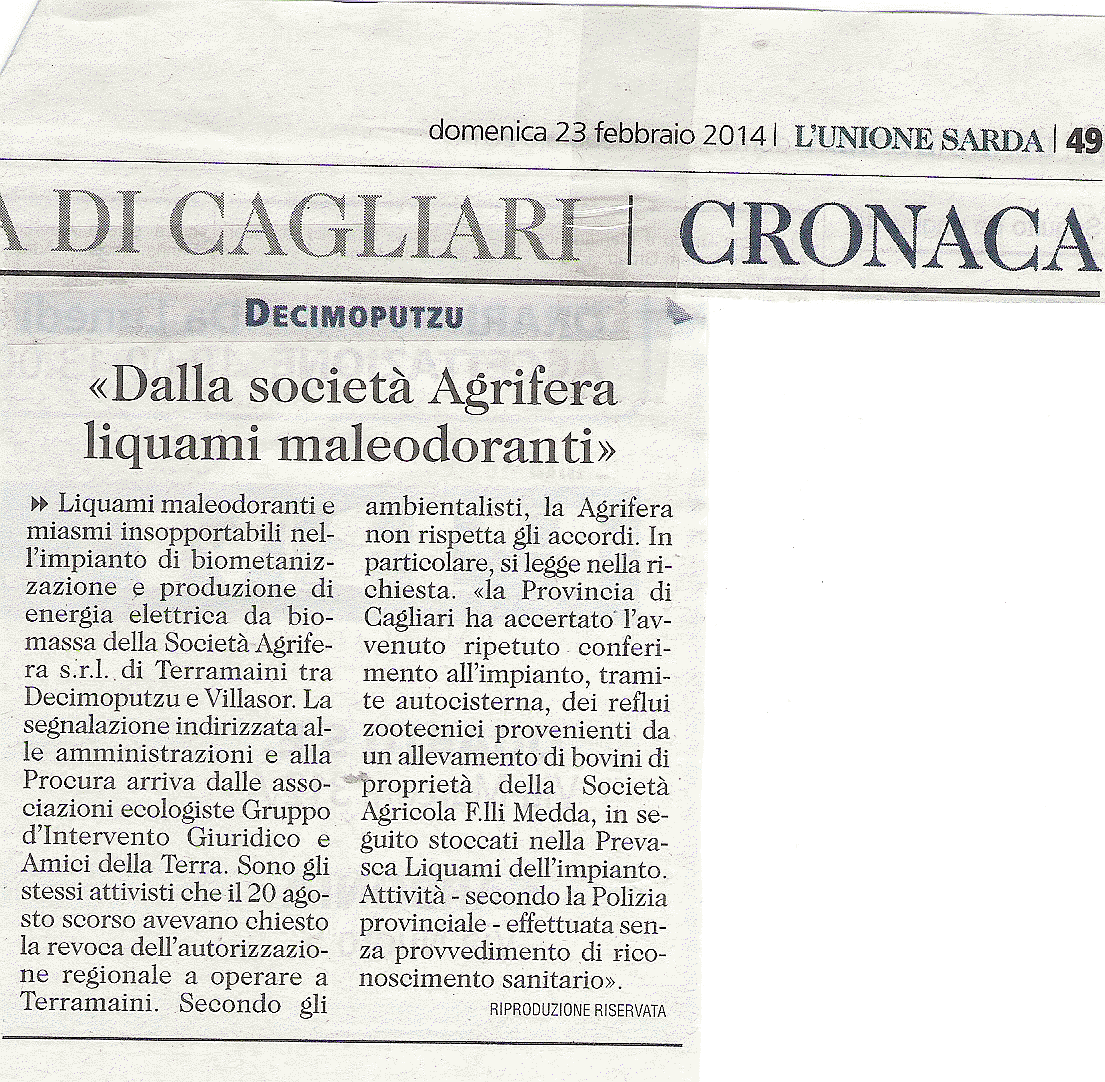 Le associazioni ecologiste Gruppo d’Intervento Giuridico e Amici della Terra hanno inoltrato (21 febbraio 2014) alle amministrazioni pubbliche e alla magistratura competenti una nuova specifica richiesta di informazioni a carattere ambientale e adozione degli opportuni provvedimenti riguardo il conferimento e spargimento di liquami maleodoranti di natura non conosciuta presso l’impianto per la produzione di energia da fonti rinnovabili, consistente in un impianto di biometanizzazione e produzione di energia elettrica da biomassa per conto della Società Agricola Agrifera s.r.l. situata nella zona agricola di Terramaini, in gran parte nel Comune di Decimoputzu e in piccola parte nel Comune di Villasor (CA).