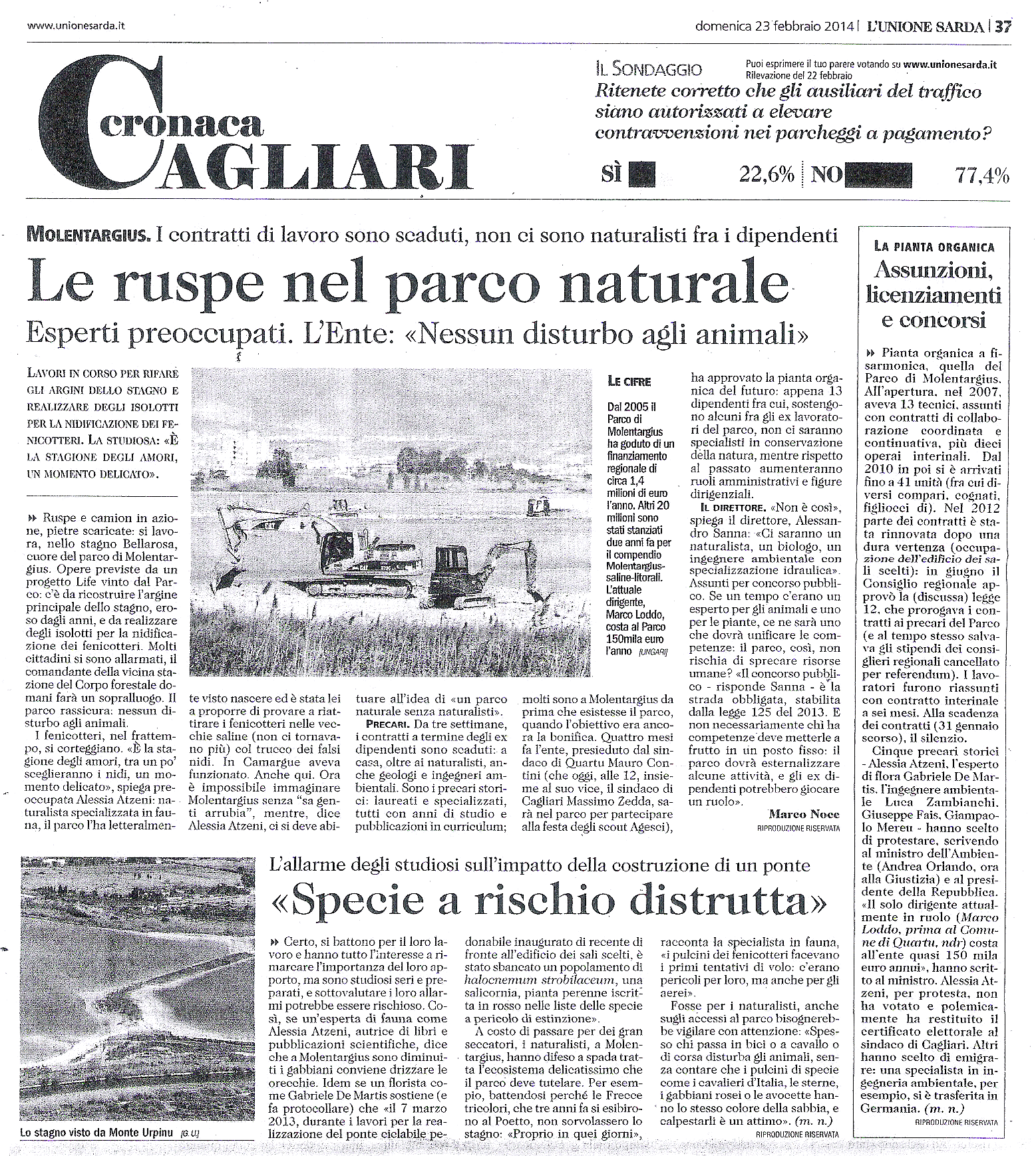 Dovrebbero esser quindi superate le tante preoccupazioni espresse in questi giorni, anche da parte di quei vari professionisti già contrattualizzati per anni dal Consorzio di gestione dell’Area naturale protetta. Anche denunce pubbliche, come quella del botanico Gabriele De Martis che, come riporta L’Unione Sarda (edizione del 23 febbraio 2014) “sostiene (e fa protocollare) che «il 7 marzo 2013, durante i lavori per la realizzazione del ponte ciclabile pedonabile inaugurato di recente di fronte all’edificio dei sali scelti, è stato sbancato un popolamento di halocnemum strobilaceum, una salicornia, pianta perenne iscritta in rosso nelle liste delle specie a pericolo di estinzione»”. Si tratta di quell’ottusa porcherìa, indegna di un parco naturale, denunciata pubblicamente proprio da noi nel marzo 2013.