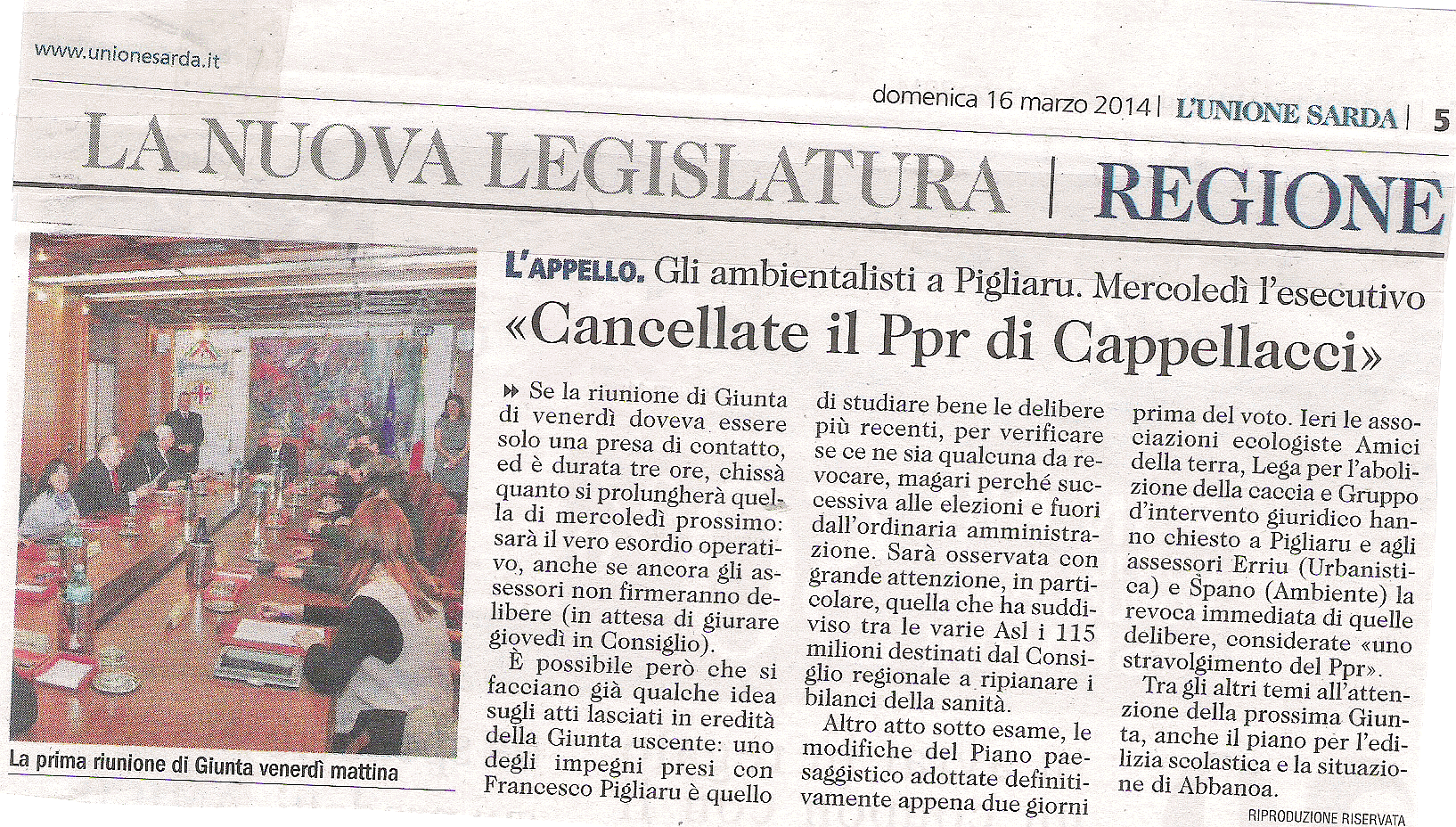 Giunta, domani prima seduta operativa. Subito cancellato il Ppr di Cappellacci: http://www.unionesarda.it/articolo/politica_italiana/2014/03/27/giunta_domani_prima_seduta_operativa_subito_cancellato_il_ppr_di_cappellacci-1-360580.html