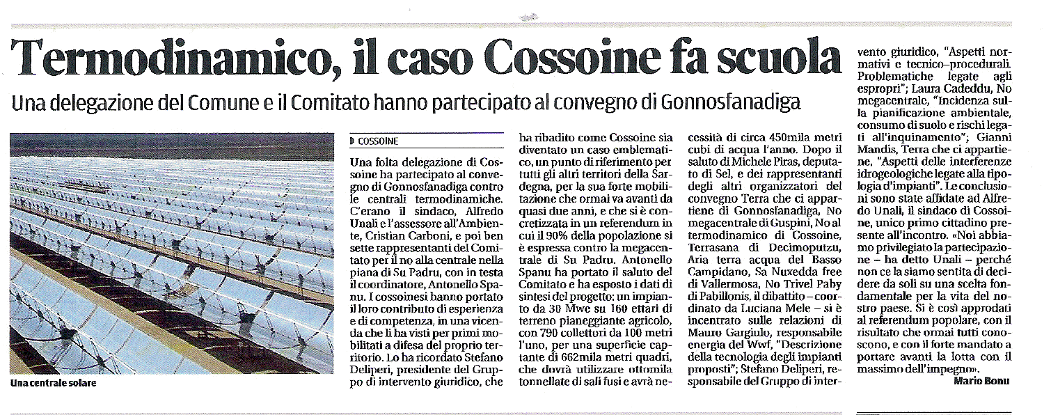Venerdi 21 marzo 2014, con inizio alle ore 18.00, presso l’ex Centro analisi della Zona artigianale di Gonnosfanadiga (VS), si tiene un dibattito pubblico sugli incombenti progetti di impianti solari termodinamici in Sardegna.