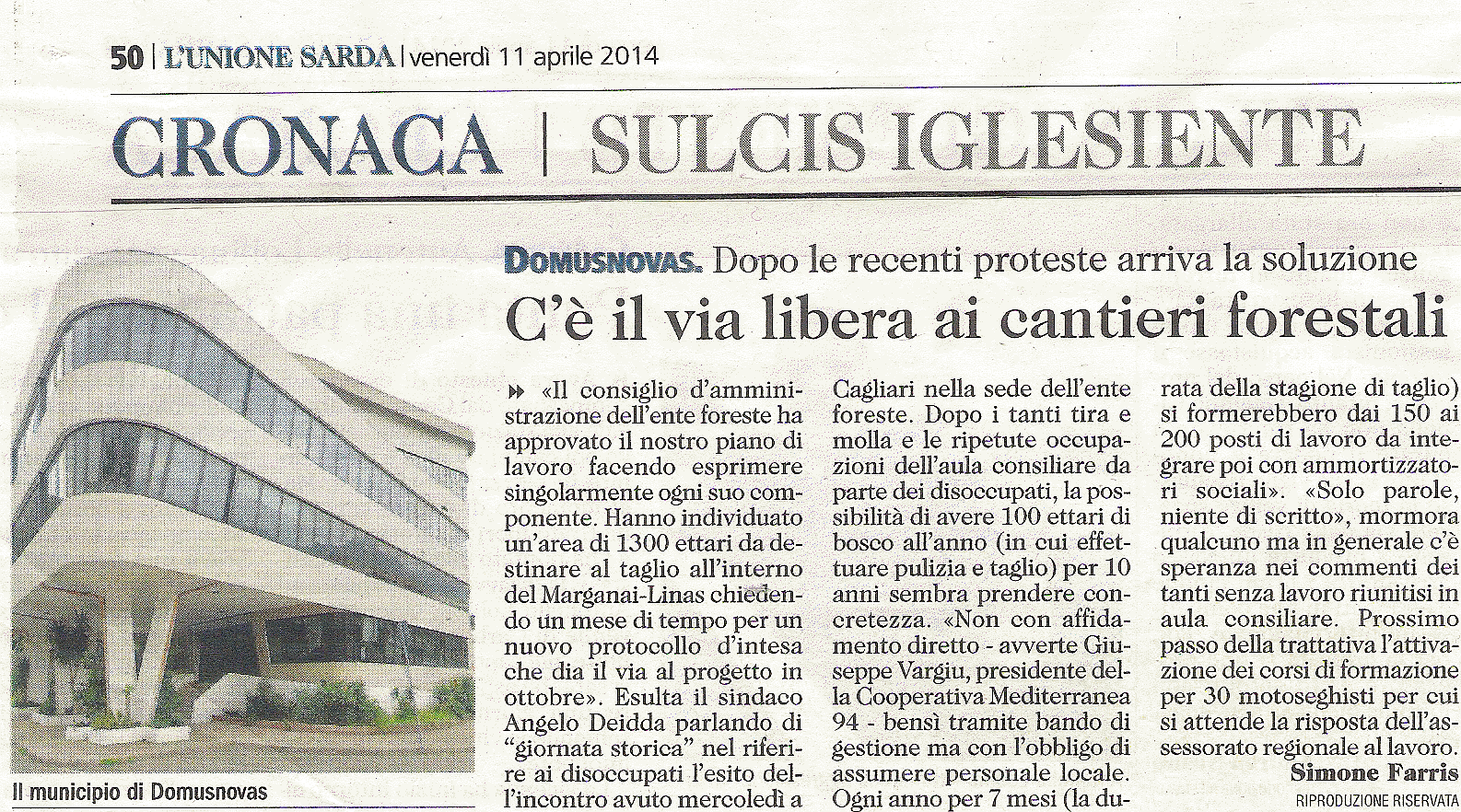 dott. Secci, abbia pazienza, ma anche sull’edizione odierna de L’Unione Sarda (pag. 50) c’è il Sindaco di Domusnovas (CI) Angelo Deidda che canta vittoria perchè il Consiglio di amministrazione dell’Ente foreste della Sardegna avrebbe deciso nella seduta del 9 aprile 2014 di destinare “un’area di 1300 ettari … al taglio all’interno del Marganai-Linas”.