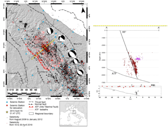Mappa (sin.) e sezione in profondità (dx) della sismicità dell’aprile 2010. La Faglia Alto Tiberina (ATF) è visibile in mappa, dove affiora in superficie, e in sezione (linea pendente debolmente a sinistra). Nelle sezioni a sinistra, una generale sotto e una zoomata sopra, si vede la Faglia Alto Tiberina (ATF) e sopra la faglia del 2010,ben individuata dai terremoti dell’aprile 201o rilocalizzati da Marzorati et al., (Tectonophysics 2013).