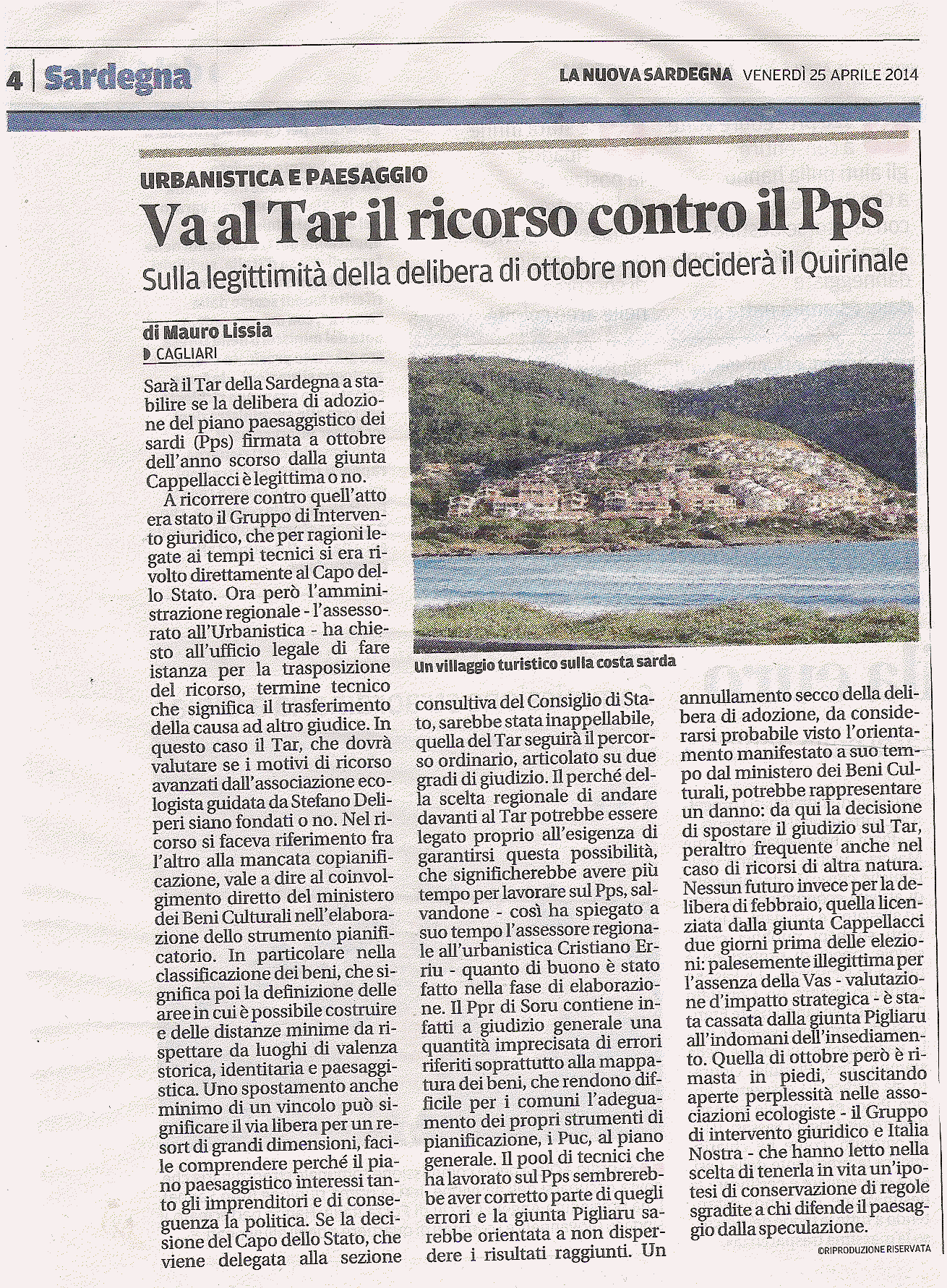 E’ stata notificata la richiesta di trasposizione davanti al T.A.R. Sardegna del ricorso straordinario al Presidente della Repubblica effettuato (febbraio 2014) dal Gruppo d’Intervento Giuridico onlus avverso lo stravolgimento del piano paesaggistico regionale da parte della precedente Amministrazione Cappellacci.