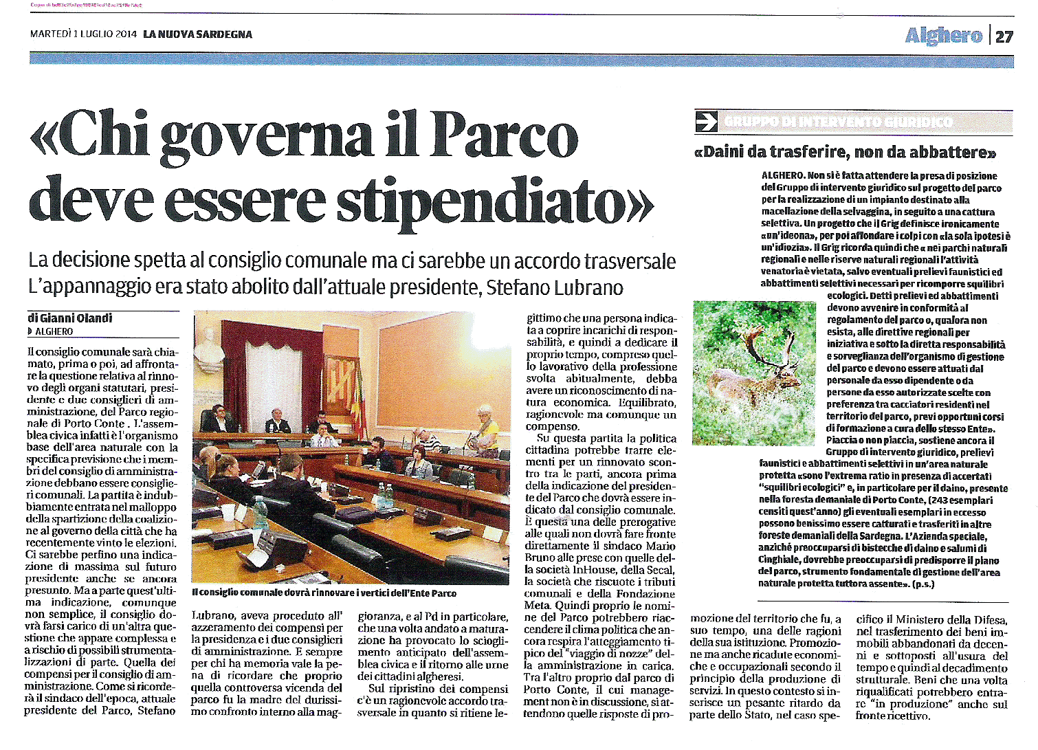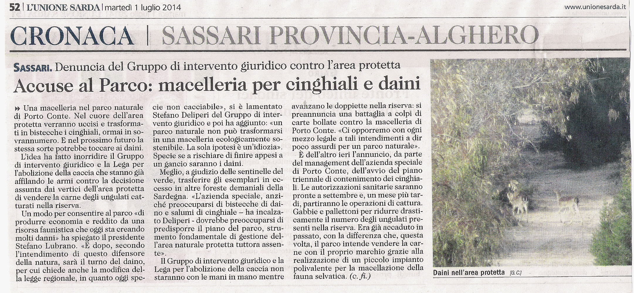 ALGHERO. Non si è fatta attendere la presa di posizione del Gruppo di intervento giuridico sul progetto del parco per la realizzazione di un impianto destinato alla macellazione della selvaggina: http://lanuovasardegna.gelocal.it/alghero/cronaca/2014/07/01/news/daini-da-trasferire-non-da-abbattere-1.9522726