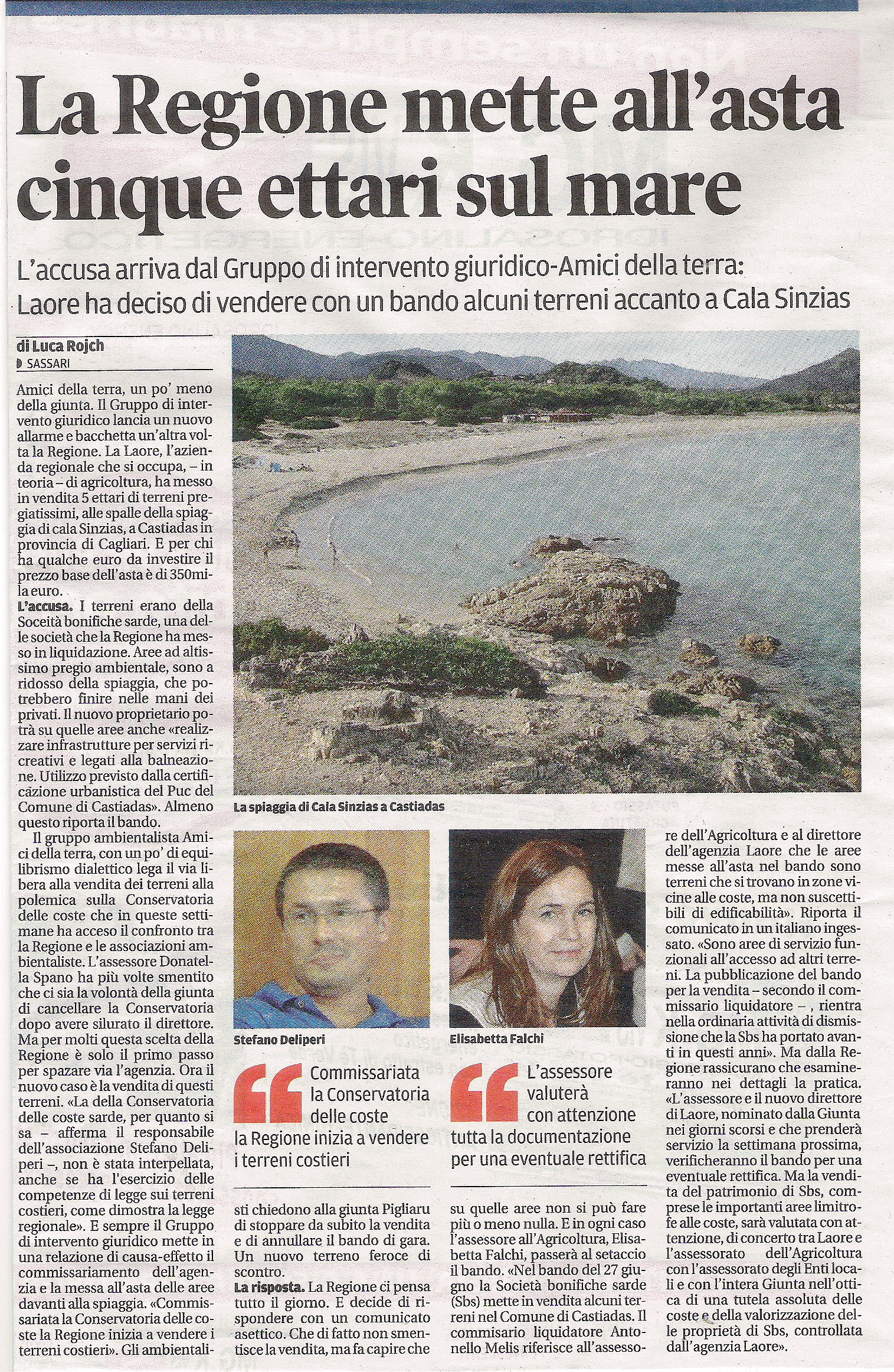 La battaglia per la tutela delle coste diventa un aspetto della guerra politico-editoriale che si combatte attorno alla giunta Pigliaru. Con l‘Unione sarda oggi in edicola che titola in prima pagina “Gli affari di De Benedetti” (l”editore del gruppo l’Espresso e de La Nuova Sardegna) un articolo dedicato alla vendita da parte della società Laore di cinque ettari di terreni di proprietà della Società Bonifiche sarde sul mare di Cala Sinzias, nel comune di Castiadas. E la Nuova Sardegna che dedicato allo stesso tema un servizio asettico.
