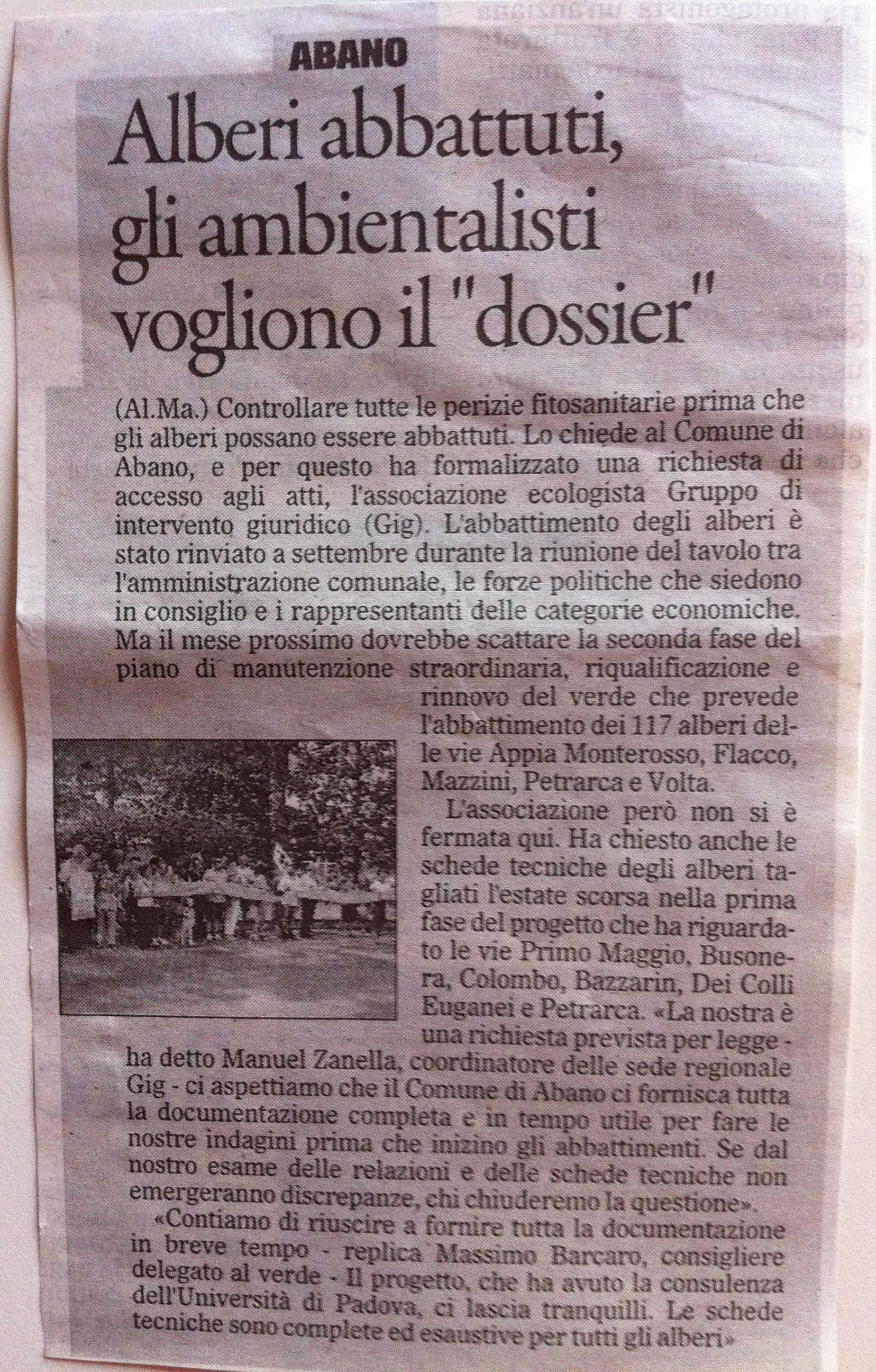 Abano Terme. I difensori degli alberi chiedono le perizie. (http://mattinopadova.gelocal.it/cronaca/2014/08/09/news/i-difensori-degli-alberi-chiedono-le-perizie-1.9736163)