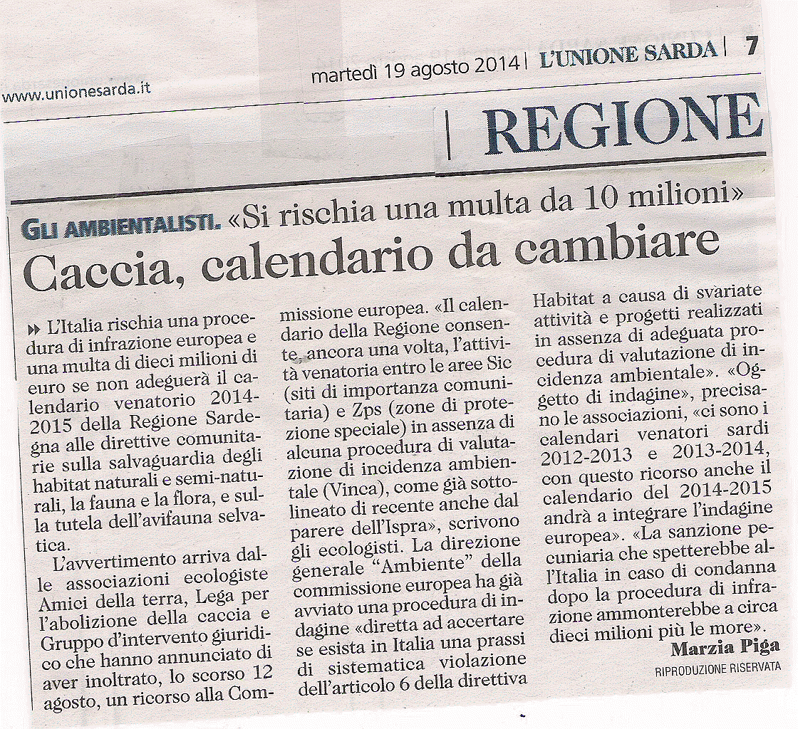 Le associazioni ecologiste Amici della Terra, Lega per l’Abolizione della Caccia, Gruppo d’Intervento Giuridico onlus hanno inoltrato (12 agosto 2014) alla Commissione europea un ricorso in merito al calendario venatorio regionale sardo 2014-2015 (decreto assessoriale n. 16377/DecA/1 del 28 luglio 2014 + allegato 1, allegato 2, allegato 3) in quanto consente, ancora una volta, l’attività venatoria entro le aree S.I.C. e Z.P.S. in assenza di alcuna procedura di valutazione di incidenza ambientale (V.INC.A.).