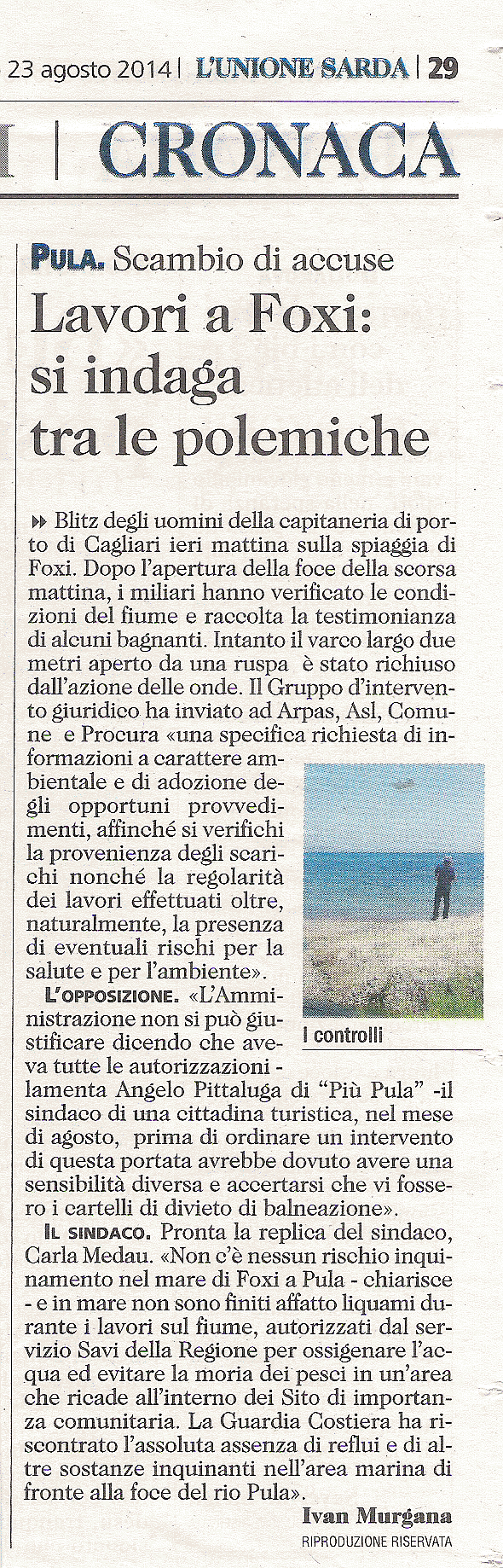 L’associazione Gruppo d’Intervento Giuridico ha, quindi, inoltrato (22 agosto 2014) a tutte le amministrazioni competenti (tra le quali l’A.R.P.A.S., la A.S.L. n. 8, il Sindaco del Comune di Pula e, per conoscenza, il Procuratore della Repubblica presso il Tribunale di Cagliari) una specifica richiesta di informazioni a carattere ambientale e di adozione degli opportuni provvedimenti, affinché si verifichi la provenienza degli scarichi nonché la regolarità dei lavori effettuati oltre, naturalmente, la presenza di eventuali rischi per la salute della collettività e per l’ambiente circostante.