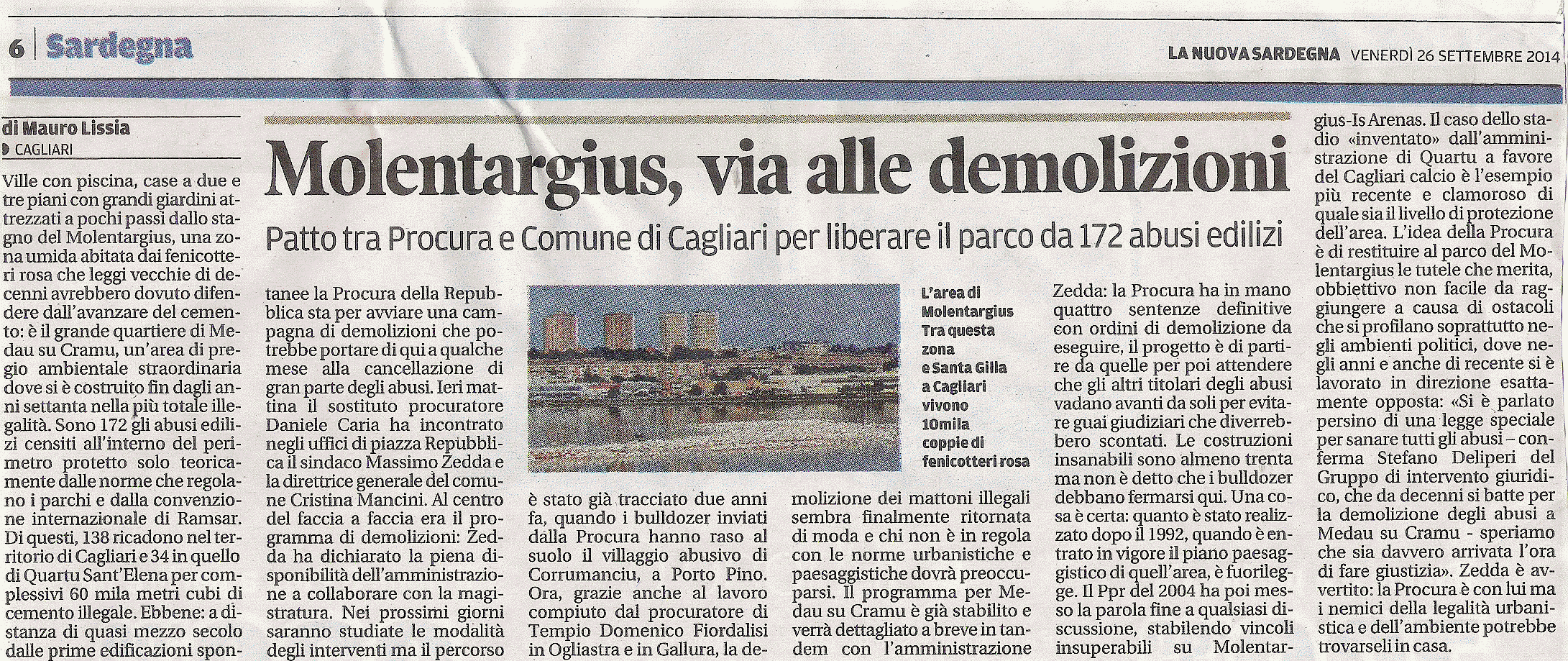 Molentargius, ancora un rinvio. Abusi nel Parco: la Commissione urbanistica prende tempo. (Marco Noce): http://www.regione.sardegna.it/rassegnastampa/1_231_20141001083729.pdf