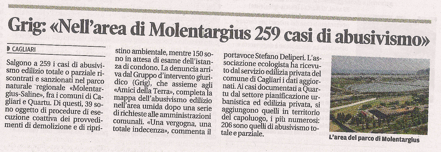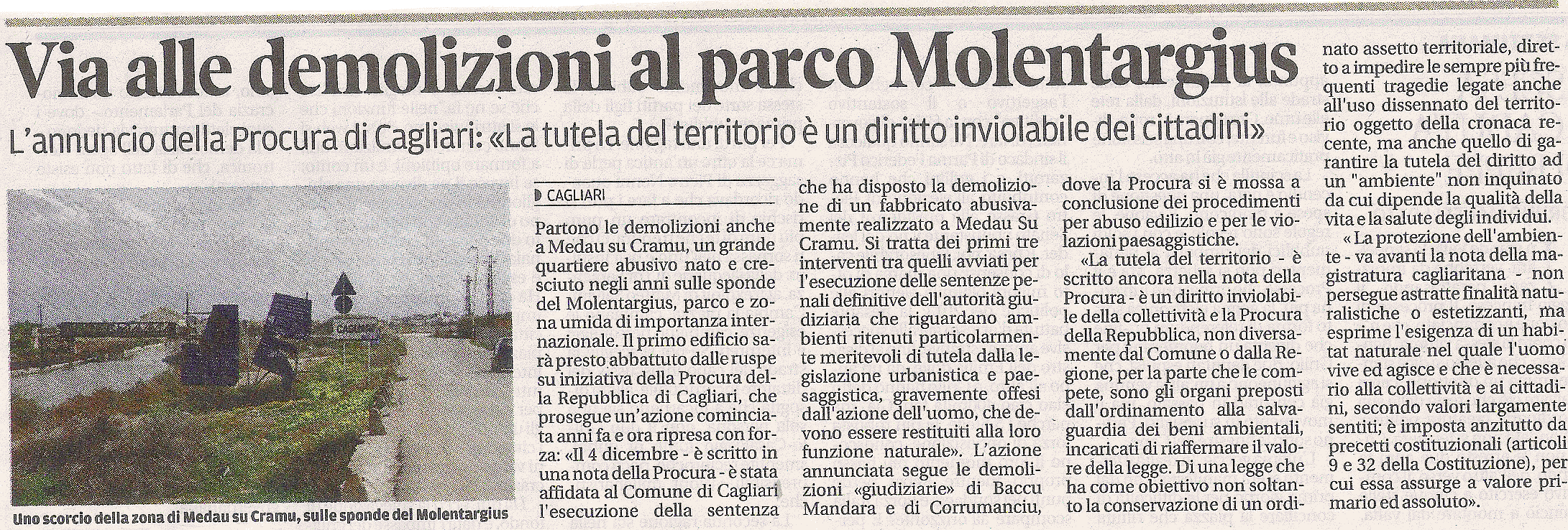Abusi: c’è l’ipotesi ruspe. Centinaia gli edifici a rischio nell’area del parco: tremano in molti. Molentargius, Comune e Procura: «Demolizioni». (Marco Noce): http://www.comunecagliarinews.it/rassegnastampa.php?pagina=40391