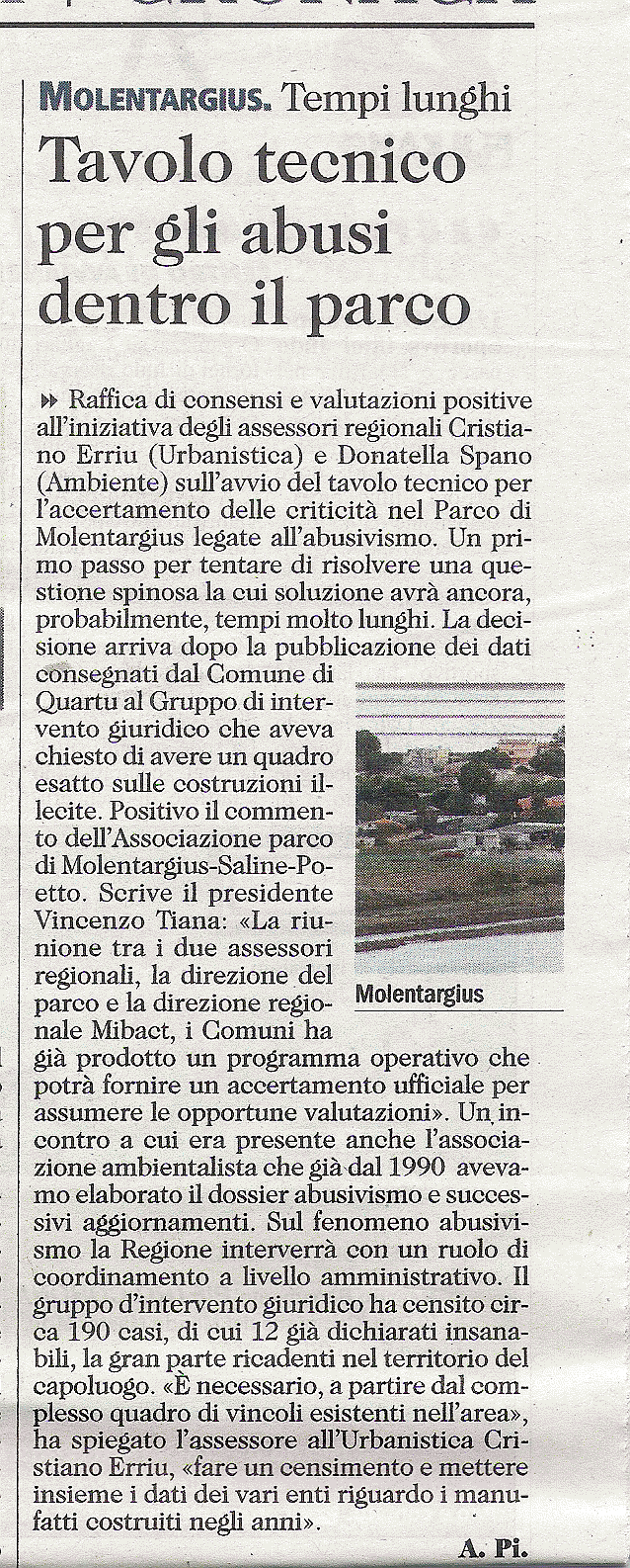 In questi giorni – spinti dalle denunce delle associazioni ecologiste Amici della Terra e Gruppo d’Intervento Giuridico onlus – le amministrazioni pubbliche competenti sembrano svegliarsi da un torpore pluridecennale, al pari di associazioni ambientaliste quasi incistate nel parco naturale ma poco propense a battersi contro un fenomeno che pure ben conoscono. Il 25 settembre 2014 si è svolto un “tavolo tecnico” sull’abusivismo edilizio nell’area naturale protetta “presenti gli assessori regionali dell’Urbanistica Cristiano Erriu e dell’Ambiente Donatella Spano, insieme ai rappresentanti competenti dei comuni di Cagliari e Quartu Sant’Elena e del Parco Naturale e il rappresentante del Ministero dei Beni e delle Attività Culturali e del Turismo (Mibact)”. Risultato? “l’abusivismo frena la crescita e l’attuazione del piano di sviluppo del Parco. Siamo determinati a dare impulso a un lavoro congiunto per mettere a regime i manufatti sanabili e attuare un reale coordinamento di azioni amministrative che sono di tipo urbanistico, ambientale e sanitario”.