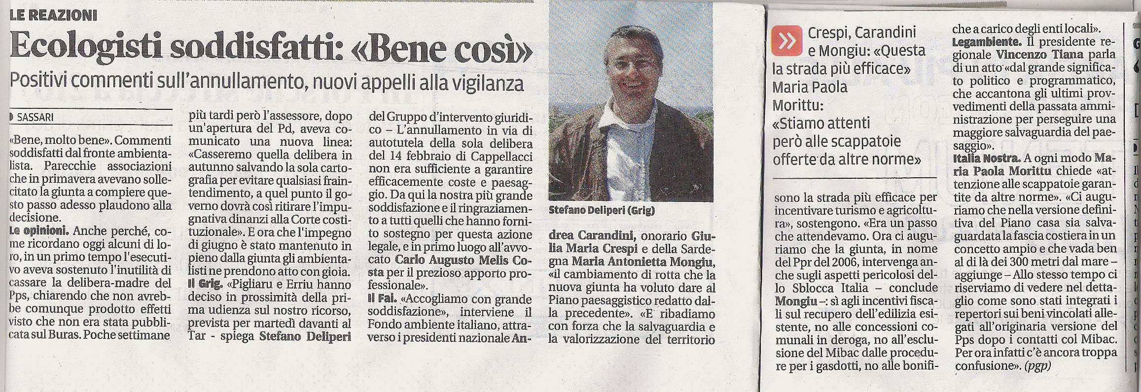 Soddisfazione anche da parte di Legambiente, che definisce la decisione un “positivo atto di coraggio e lungimiranza della Giunta Pigliaru”. “Esprimiamo la nostra soddisfazione – commenta Vincenzo Tiana, presidente di Legambiente Sardegna – per un atto di grande significato politico e programmatico”. Legambiente ribadisce che il “Pps” della Giunta Cappellacci “conteneva meno tutele territoriali del Ppr dal momento che avrebbe permesso di realizzare maggiori edificazioni nell’ambito costiero. Di tutto ha bisogno la Sardegna, con migliaia di seconde case vuote gran parte dell’anno, che di coprire le coste con nuove costruzioni”.