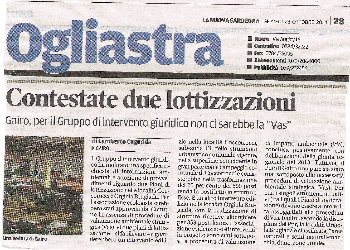 L’associazione ecologista Gruppo d’Intervento Giuridico onlus ha inoltrato (22 ottobre 2014) una specifica richiesta di informazioni ambientali e adozione provvedimenti riguardo due piani di lottizzazione nelle località Coccorocci e Orgiola Brugiada approvati dal Comune di Gairo (OG) in assenza di procedure di valutazione ambientale strategica (V.A.S.).