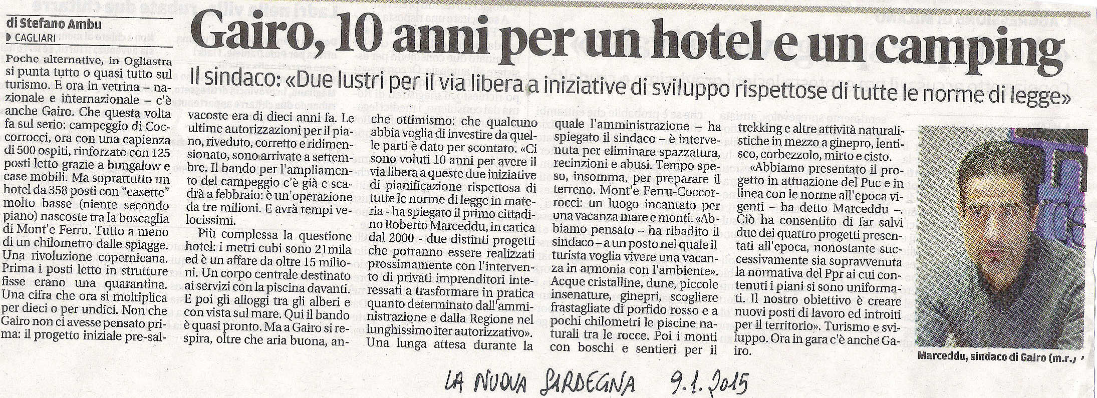 CAGLIARI, 8 GEN – Una struttura alberghiera a meno di un chilometro dalla costa, nella marina di Gairo, in Ogliastra: 358 posti letto, panoramica sul golfo, campi sportivi, un anfiteatro all’aperto, servizi, tutto nel rispetto dell’ambiente. E’ uno dei due progetti presentati dal sindaco di Gairo Roberto Marceddu. Costo complessivo: 13 milioni di euro.