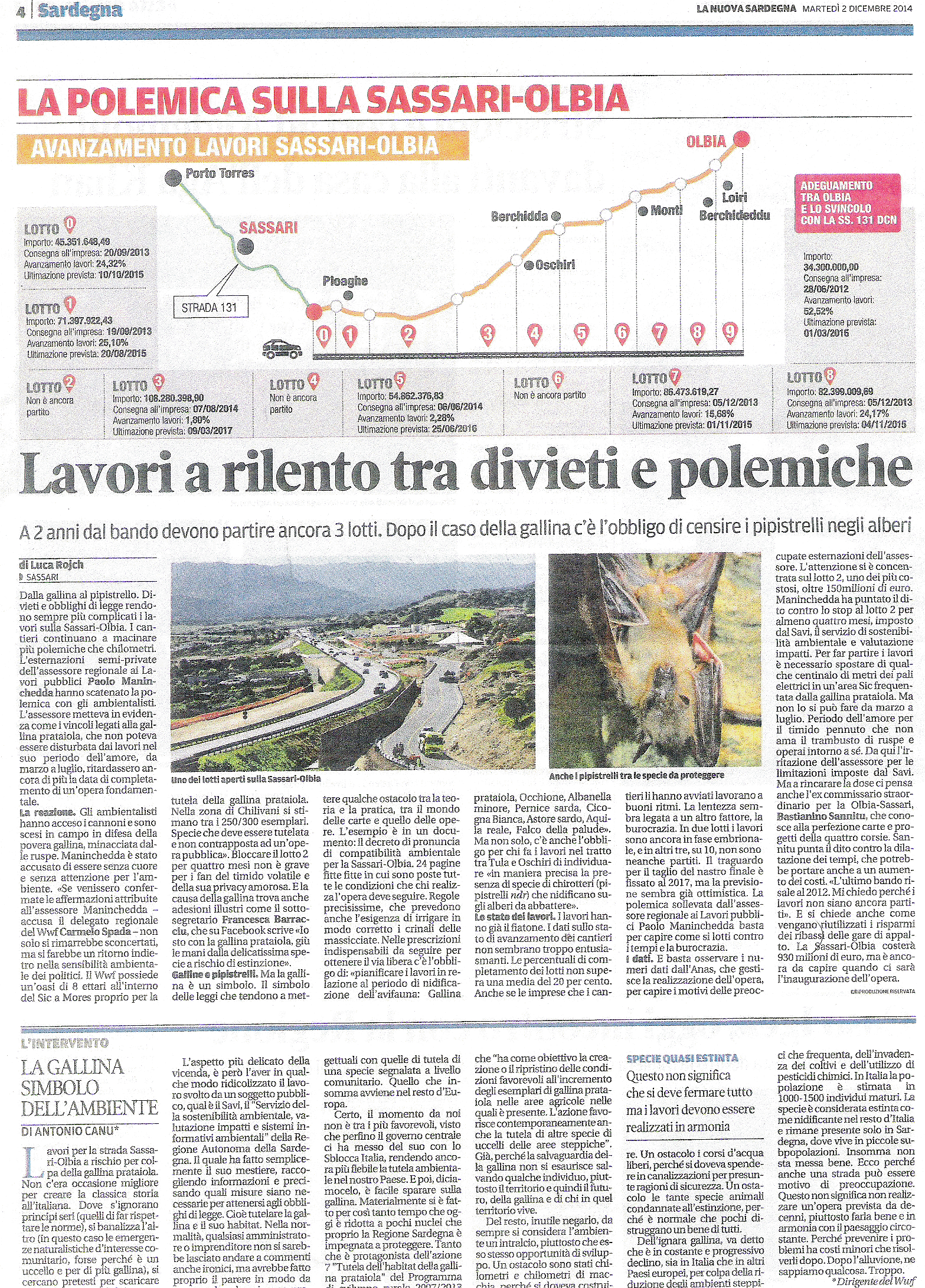 L’ex assessore Bastianino Sannitu: prevista anche una galleria per non disturbare il pennuto in amore. Divieti e imposizioni come questa hanno fatto salire il conto totale della strada a 930 milioni di euro. (Luca Roych): http://lanuovasardegna.gelocal.it/regione/2014/12/01/news/costi-cresciuti-del-25-tra-galline-e-veti-1.10412843