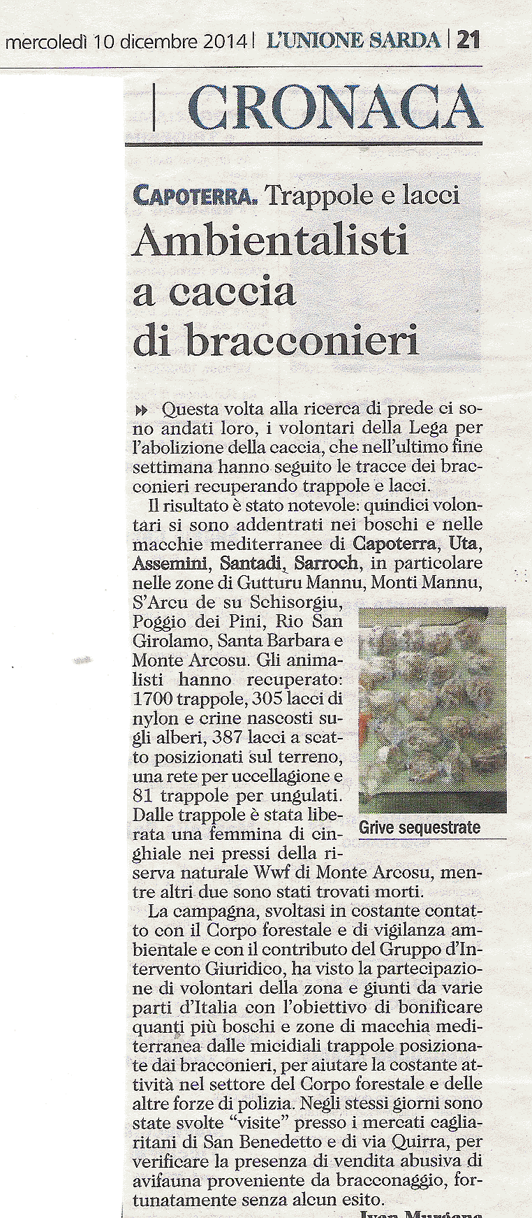 La LAC: follia la proposta di legalizzare il bracconaggio: http://www.geapress.org/caccia/cagliari-il-frutto-del-peccato-trappole-lacci-e-bracconieri-nel-mirino-dei-volontari/57864