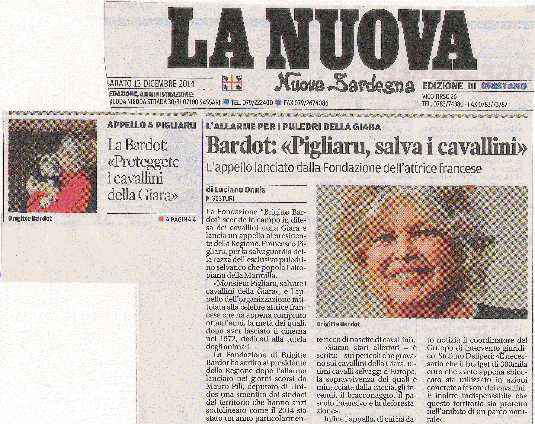 Strage dei cavallini della Giara, interviene Brigitte Bardot: “Monsieur Pigliaru, li salvi”: http://www.sardegnaoggi.it/Cronaca/2014-12-12/27329/Strage_dei_cavallini_della_Giara_interviene_Brigitte_Bardot_Monsieur_Pigliaru_li_salvi.html