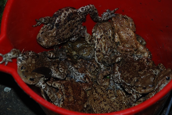 Colli Euganei, Rospi aiutati nella migrazione dai volontari (vengono posti in bacinelle per poi esser liberati oltre le strade)