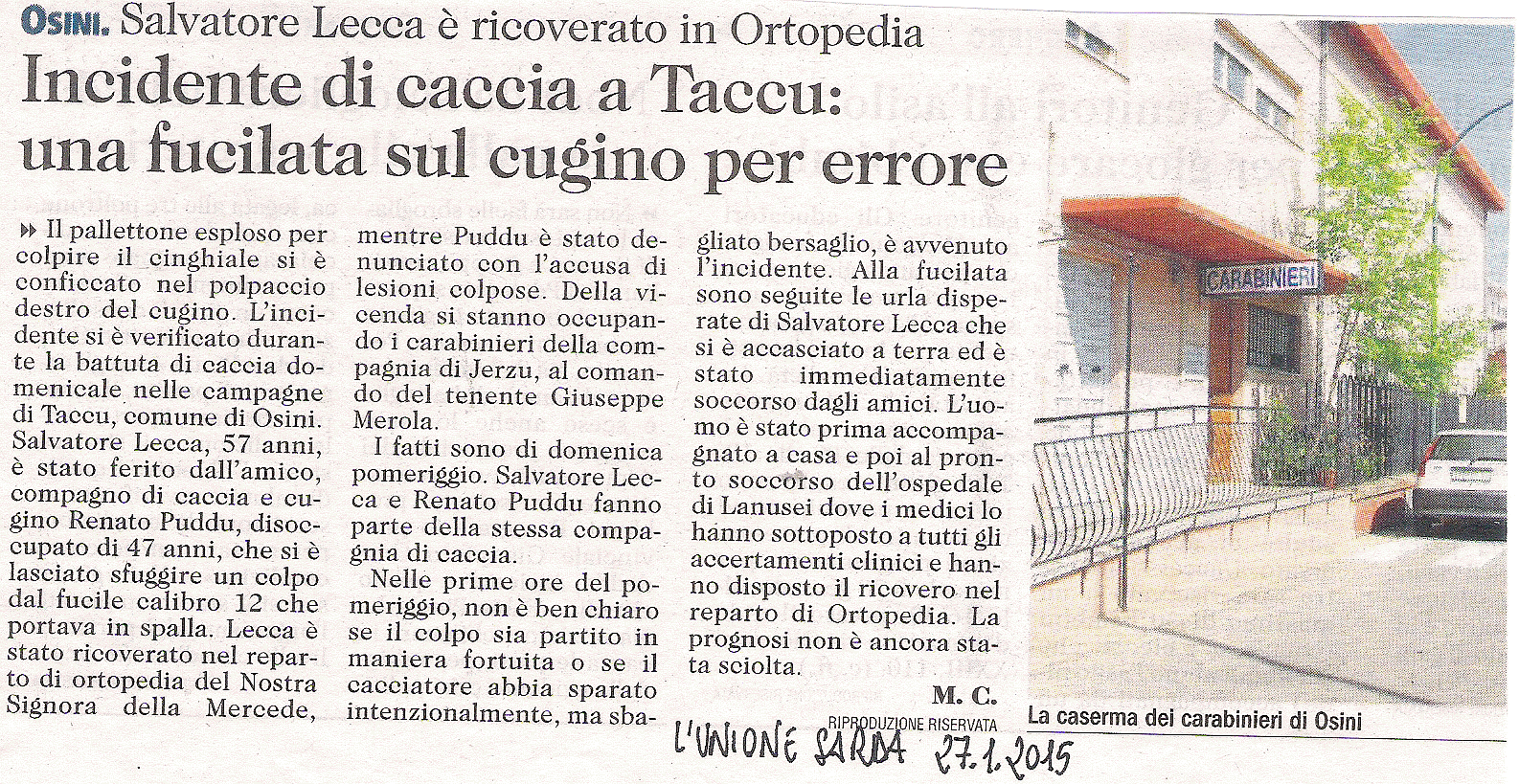Questa volta un altro cacciatore ferito, Salvatore Lecca (57 anni) è stato ferito dal cugino, Renato Puddu (47 anni), durante una battuta di caccia al Cinghiale nelle campagne di Taccu (Osini), in Ogliastra.