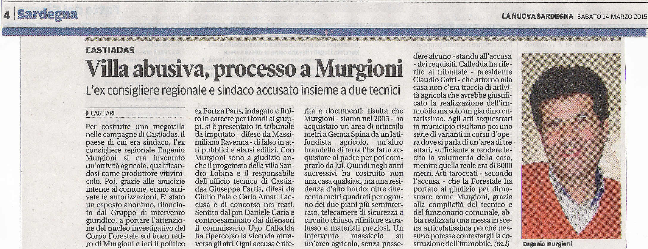 Castiadas, abusi edilizi nella sua villa: chiesta la condanna dell’ex sindaco Murgioni: http://www.unionesarda.it/articolo/cronaca/2016/03/31/castiadas_abusi_edilizi_nella_sua_villa_chiesta_la_condanna_dell-68-483387.html