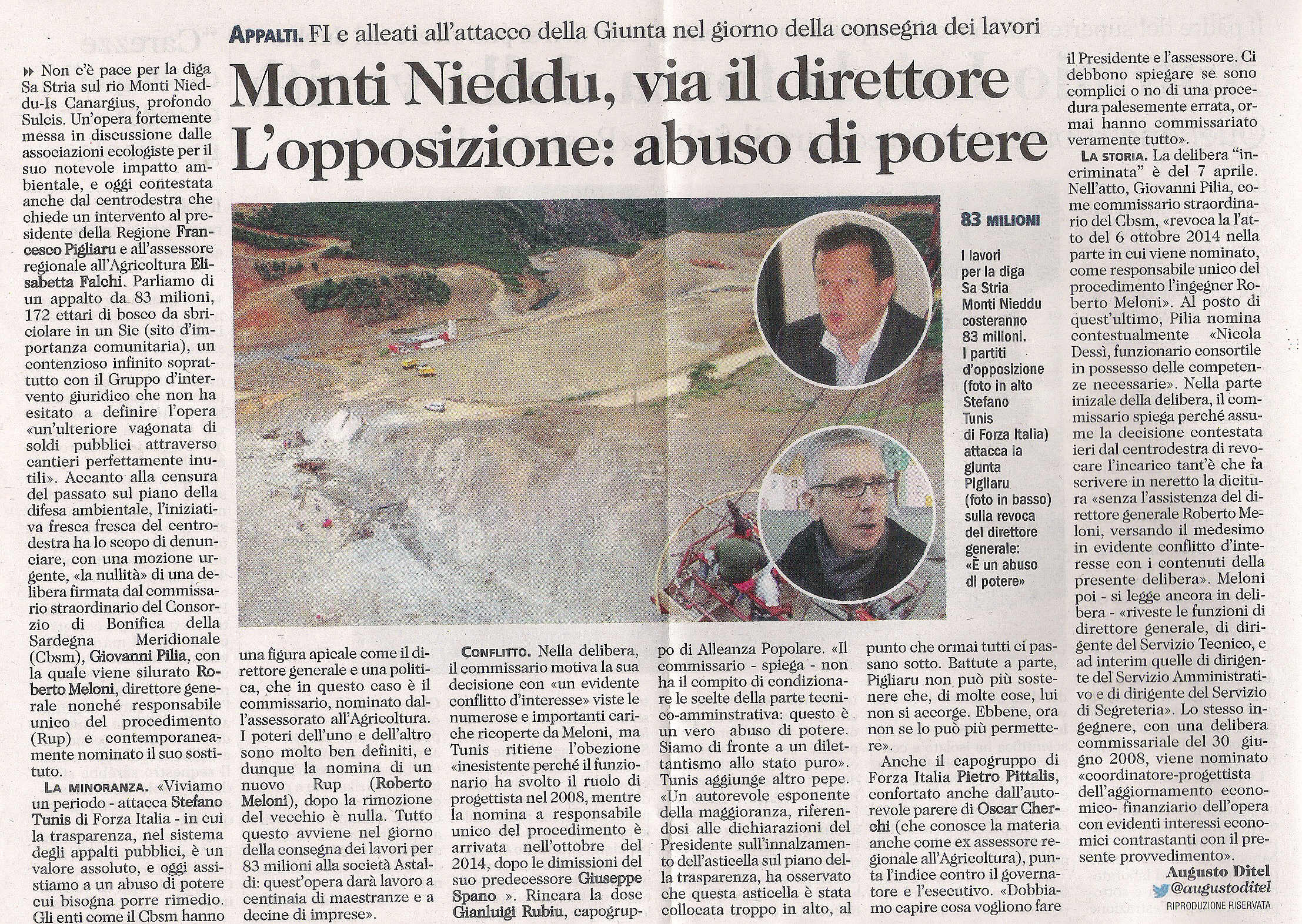 “La sua decisione di revocare la nomina del direttore dei lavori della diga di Monti Nieddu, contestata dall’opposizione, è improntata al rispetto del mandato conferitogli e secondo legalità”: http://www.cagliaripad.it/news.php?page_id=17172