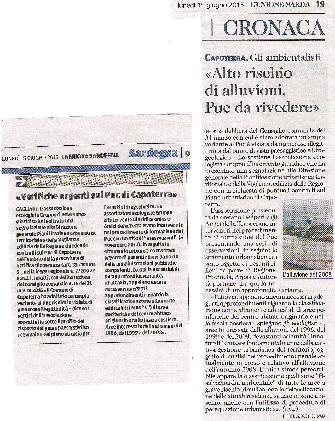 L’associazione ecologista Gruppo d’Intervento Giuridico onlus ha inoltrato (14 giugno 2015) una specifica segnalazione alla Direzione generale Pianificazione urbanistica territoriale e della Vigilanza edilizia della Regione autonoma della Sardegna con la richiesta di puntuali controlli sul piano urbanistico comunale (P.U.C.) di Capoterra nell’ambito della procedura di verifica di coerenza (art. 31, comma 5°, della legge regionale n. 7/2002 e s.m.i.).