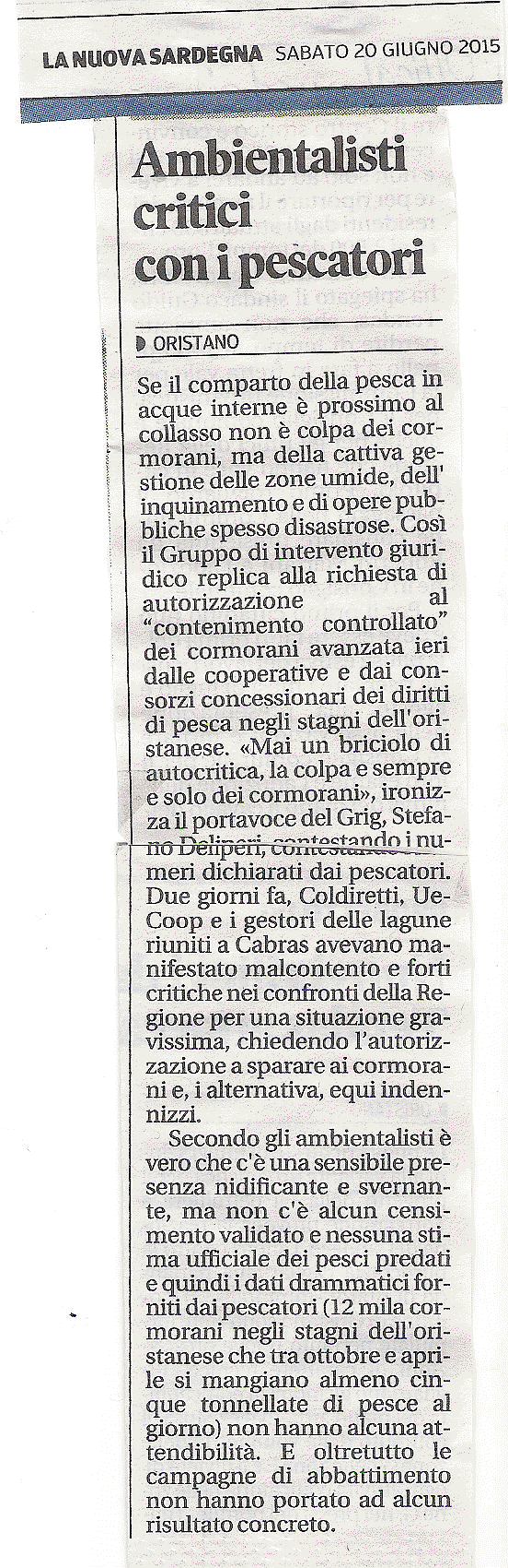 Il Grig con i cormorani contro le coop di pescatori: “Disastro non è colpa loro: cattiva gestione delle aree umide”: http://notizie.tiscali.it/regioni/sardegna/articoli/15/06/19/caccia-cormorani-cabras.html