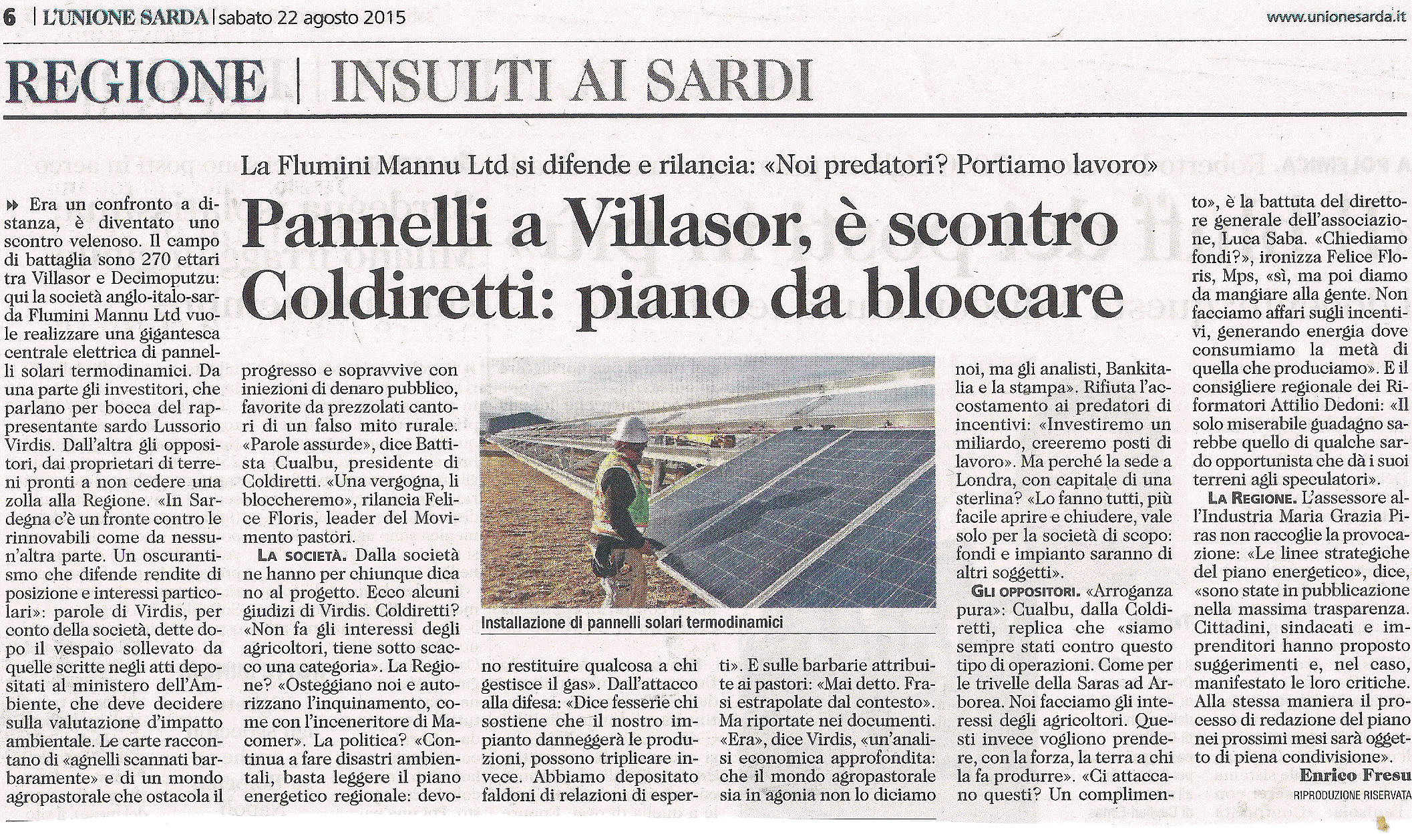 Il caso del progetto di centrale solare termodinamica a concentrazione Flumini Mannu ltd (potenza complessiva lorda 55 MWe, sede legale a Londra, in Bow Road n. 221, e sede fiscale a Macomer, in Corso Umberto I n. 226), nelle campagne fra Decimoputzu e Villasor (CA), su un’area di ben 269 ettari, è emblematico per arroganza, prepotenza e ottusità.