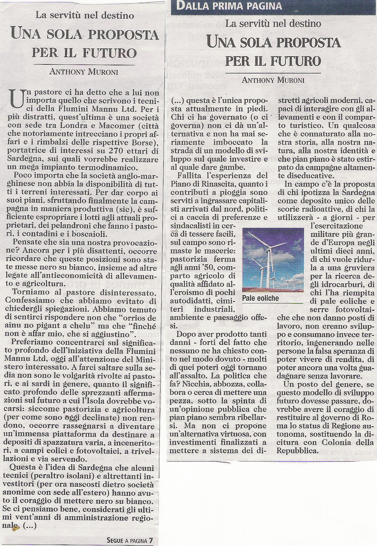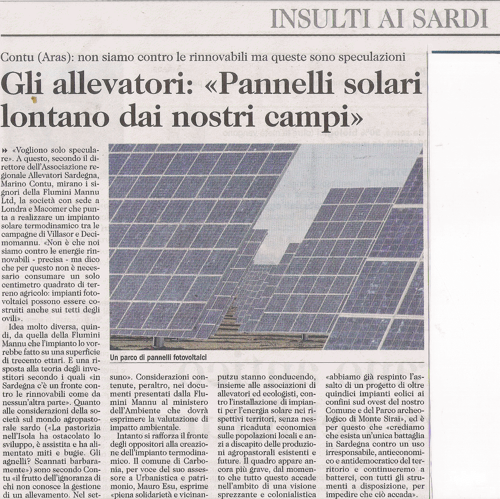 La Sardegna in futuro sarà vista sempre di più come terra da colonizzare ad opera di queste società! Il motivo?? A differenza di altre regioni italiane ormai sature dal cemento, abbiamo vastissimi territori dove abbondano i pascoli e la macchia mediterranea. Loro cercano di sfruttare al meglio tutte le carte a disposizione; a partire da motivi ideologici (i sardi terra di pastori barbari = eliminate la pastorizia per evolvervi) fino a giocarsi il “jolly”: aprire il portafoglio e far sentire l’odore delle monete. Io mi auguro che quegli anni in cui si svendevano le terre per quattro spicci siano finiti..Purtroppo tutt’oggi si pagano i danni di 60 anni fa. Quante “cattedrali nel deserto” abbiamo conosciuto? stiamo pagando le conseguenze ambientali di analoghi progetti ” di sviluppo” che oltre alla beffa di aver deturpato i territori e resi inutilizzabili per qualsiasi funzione, lasciano a nostre spese tutti i costi di smaltimento, con il risultato che conosciamo già, ossia ettari di terre sottratti all’agricoltura e alla pastorizia convertiti in poli industriali ormai falliti..che lasciano a distanza di anni le loro cicatrici!