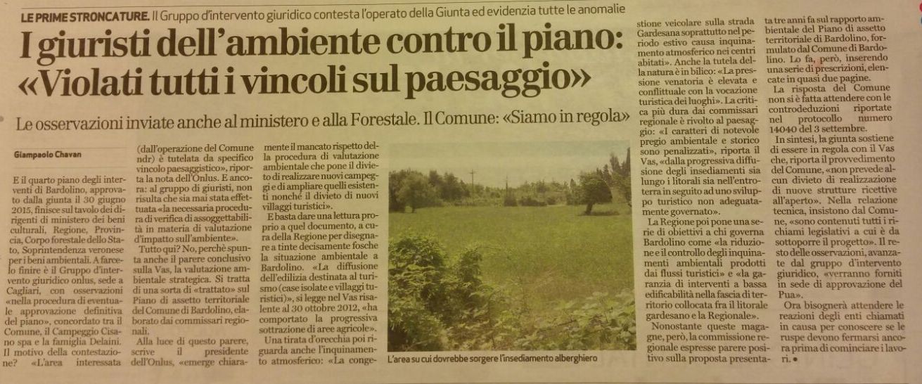 L’associazione ecologista Gruppo d’Intervento Giuridico onlus ha inoltrato (2 settembre 2015) uno specifico atto di intervento con “osservazioni” nella procedura di eventuale approvazione definitiva del IV piano degli interventi del territorio di Bardolino (VR), comprendente un progetto di complesso immobiliare a Cisano, sul Lago di Garda.