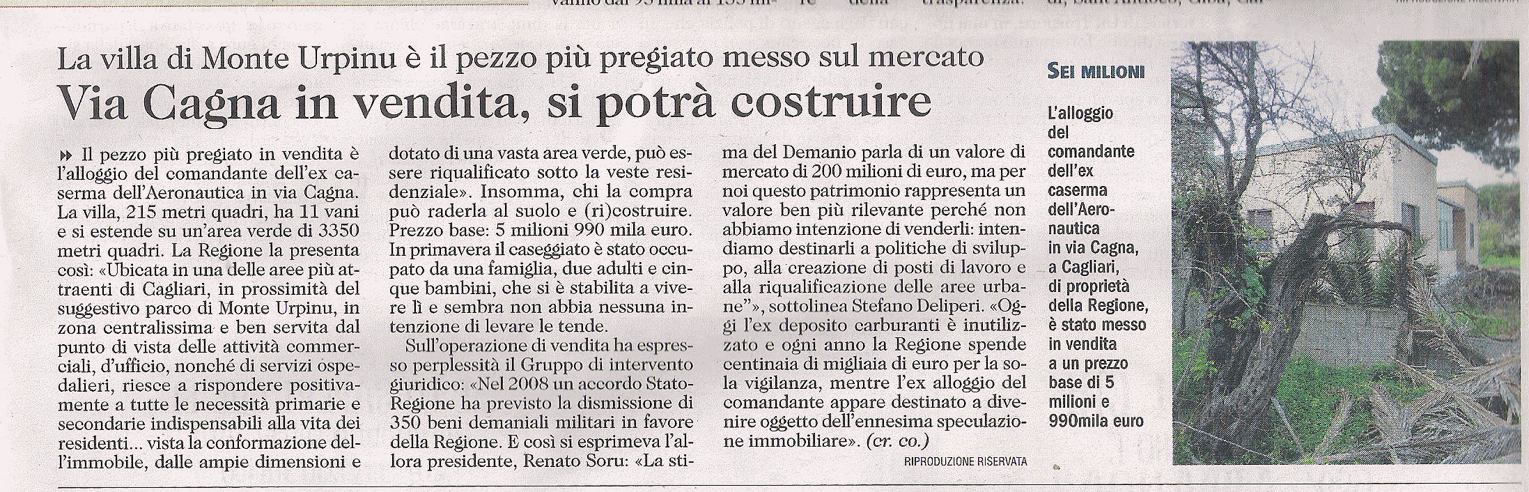 Oggi la Giunta regionale coerentemente ha messo in vendita diversi beni immobili per fare cassa, sperando di ricavarne complessivamente 50 milioni di euro. Fra questi l’ex alloggio del comandante del 68° deposito carburanti dell’Aereonautica Militare, situato alle pendici di Monte Urpinu (Cagliari), bene acquisito proprio con le dismissioni del 2008. Prezzo a base d’asta euro 5.990.000,00.