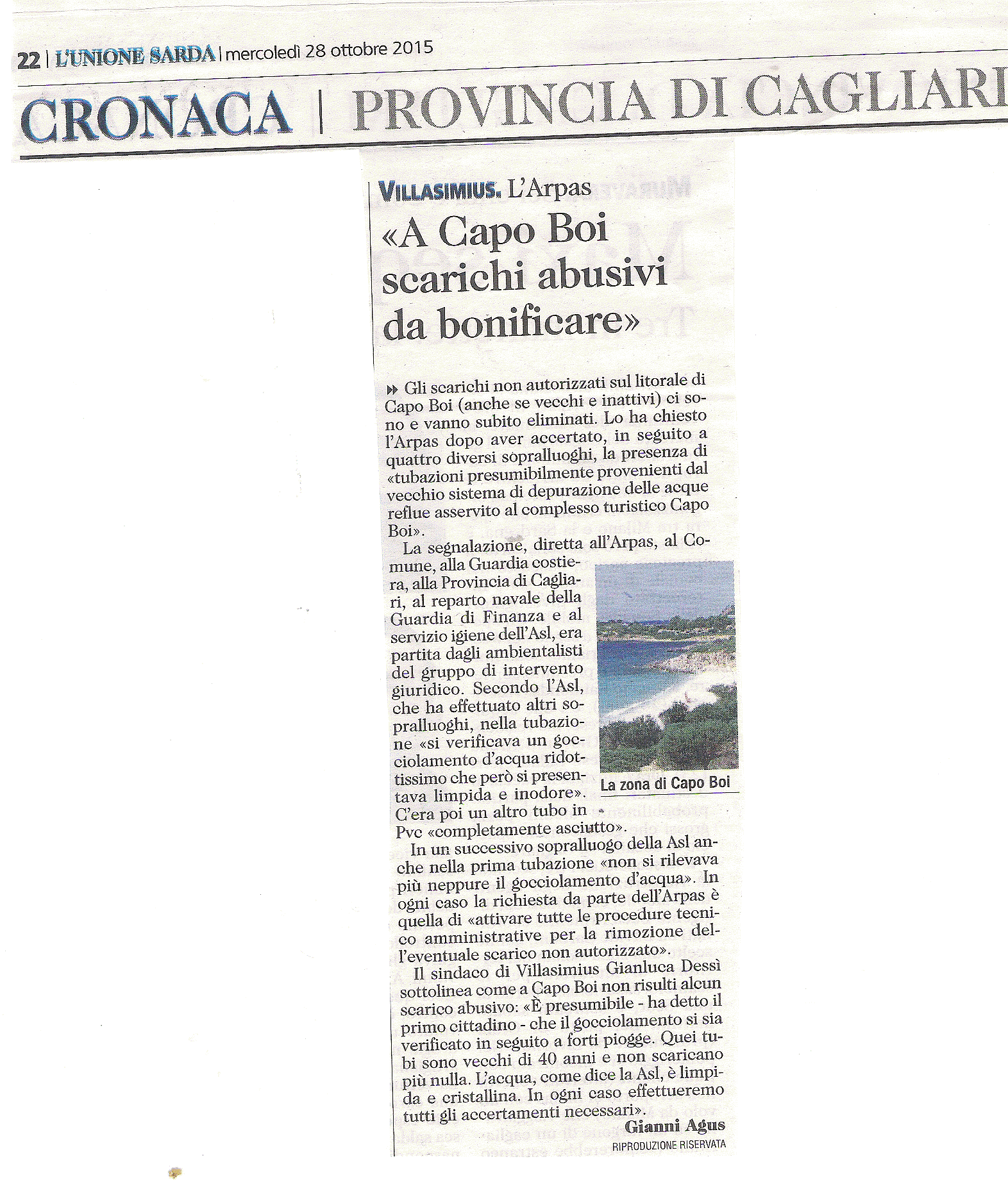 L’A.R.P.A.S. – Dipartimento di Cagliari e Medio Campidano ha risposto (nota prot. n. 34468 del 22 ottobre 2015) alla richiesta di informazioni ambientali e adozione di opportuni provvedimenti riguardo una serie di scarichi a mare ubicati lungo il litorale di Capo Boi, in Comune di Villasimius (CA) inoltrata (28 agosto 2015) dall’associazione ecologista Gruppo d’Intervento Giuridico onlus.