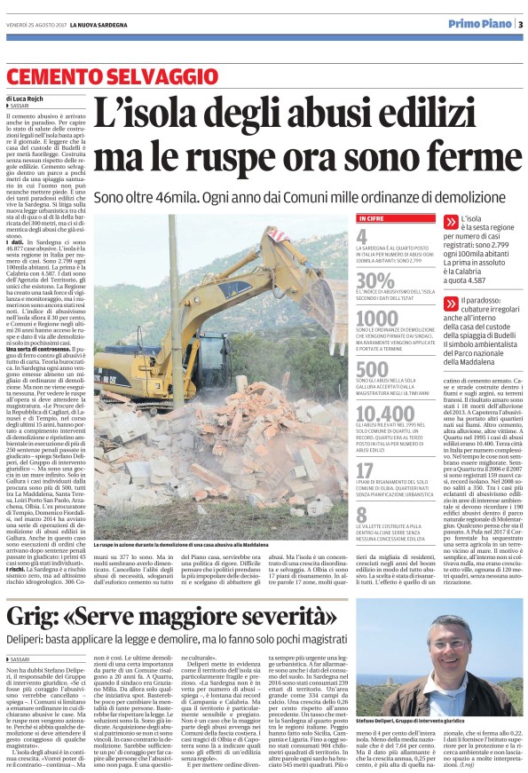 Ogni anno dai Comuni mille ordinanze di demolizione. La Sardegna è la sesta regione per numero di casi registrati: sono 2.799 ogni 100mila abitanti. La prima in assoluto è la Calabria a quota 4.587. (Luca Rojch): http://www.lanuovasardegna.it/sassari/cronaca/2017/08/26/news/cemento-selvaggio-46mila-abusi-edilizi-nell-isola-ma-le-ruspe-ora-sono-ferme-1.15774876?ref=search